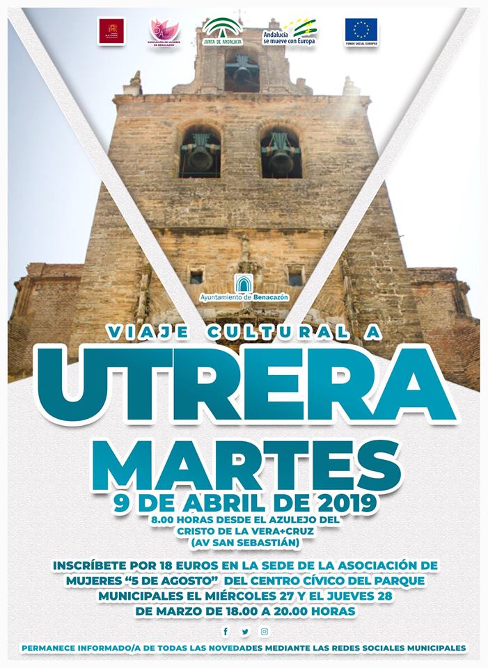 Desde el Ayuntamiento de Benacazón te informamos sobre el viaje organizado por nuestras Áreas municipales de Igualdad y de Turismo en coordinación con Prodetur, organismo dependiente de la Diputación de Sevilla, y la Asociación de Mujeres "5 de Agosto" de Benacazón a Utrera para el martes 9 de abril de 2019. Este viaje turístico de la Asociación de Mujeres cuenta con la colaboración la Técnica de Turismo adscrita al Programa Emple@30 , por lo que esta actividad está financiada por la Junta de Andalucía y por el Fondo Social Europeo.