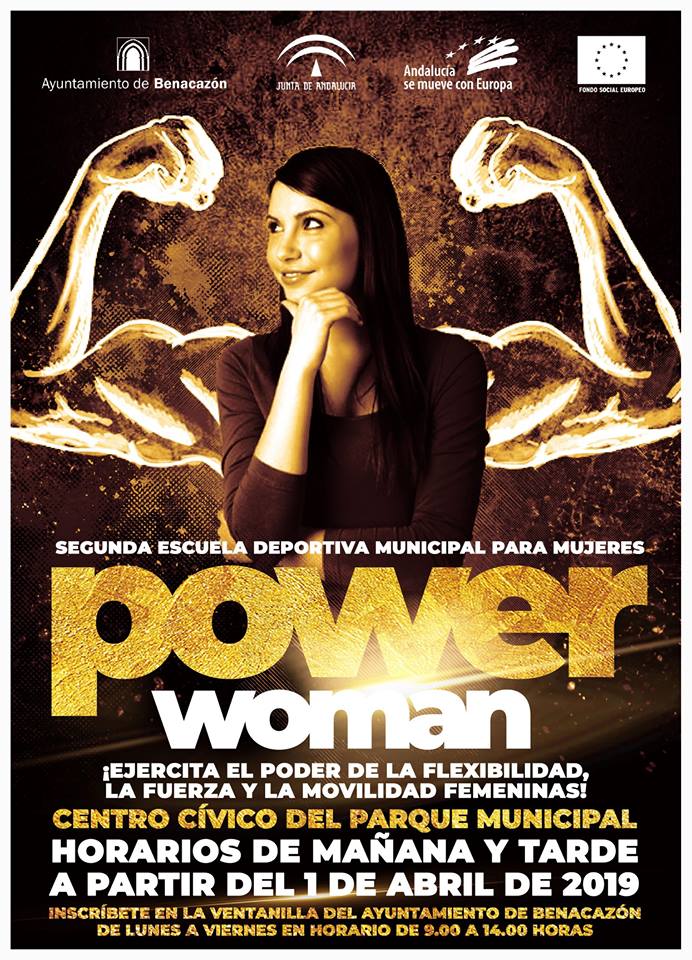Desde el Ayuntamiento de Benacazón tenemos el placer de presentarte "PowerWoman", la segunda escuela deportiva destinada a mujeres mayores de 18 años y cuyos objetivos son trabajar un desarrollo físico y deportivo más sano, mejorar la formación integral mediante el entrenamiento en grupo y emplear el tiempo de ocio de las participantes de forma divertida.