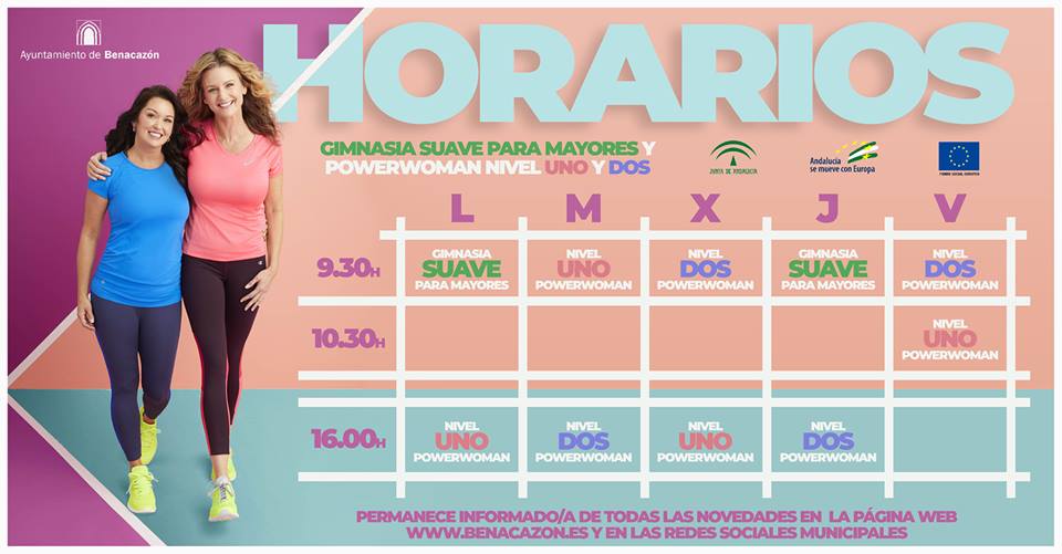 Desde el Ayuntamiento de Benacazón te informamos sobre los horarios de "PowerWoman", la segunda escuela deportiva destinada a mujeres mayores de 18 años, y de Gimnasia Suave para Mayores. "PowerWoman" se divide en horarios de mañana o tarde y dos niveles de dificultad, mientras que la Escuela de Gimnasia Suave para Mayores tiene un horario fijo de mañana, lunes y jueves de 9.30 a 10.30 horas.