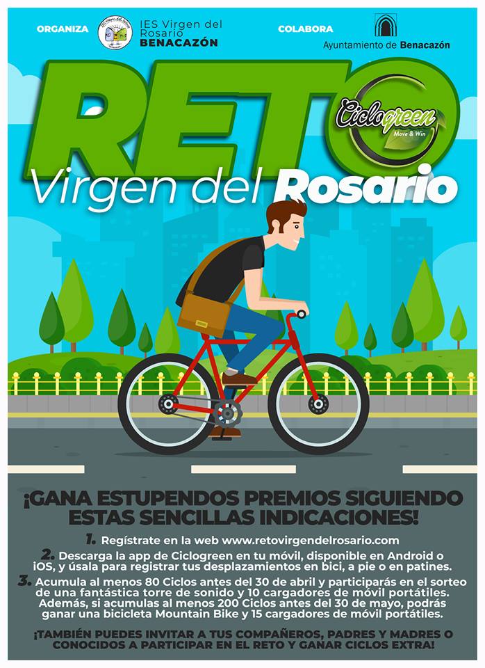 Desde el Ayuntamiento de Benacazón te pedimos que te muevas con la Comunidad Educativa del IES Virgen del Rosario (alumnos, profesores, PAS, padres y madres), ayudes a frenar el Cambio Climático, hagas ejercicio físico mientras ganas estupendos premios. Accede a toda la información en la web del IES Virgen del Rosario mediante el siguiente enlace https://iesvirgendelrosario.com/2019/03/26/segundo-reto-ciclogreen-ies-virgen-del-rosario/