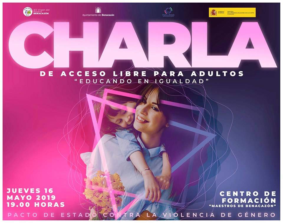 Desde el Ayuntamiento de Benacazón te informamos sobre la Charla "Educando en Igualdad", de acceso libre para adultos, que tendrá lugar el jueves 16 mayo de 2019 a las 19.00 horas en el Centro de Formación "Maestros de Benacazón". Esta actividad está incluida en la programación de "Educa en Violeta", un conjunto de actividades educativas contra la Violencia de Género que en las próximas semanas van a realizarse a propuesta del Área municipal de Mujer e Igualdad, financiadas por el Ministerio de la Presidencia, Relaciones con las Cortes e Igualdad, a través de la Secretaría de Estado de Igualdad.