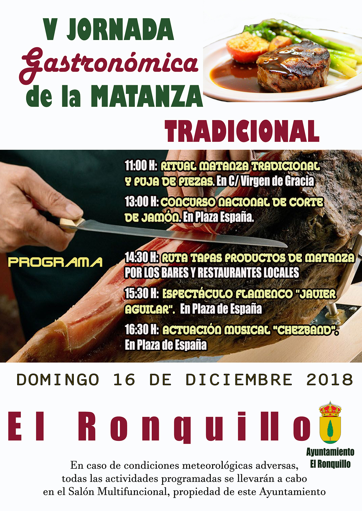 Fecha inicio Dom, 16/12/2018 - 11:00 Fecha fin Dom, 16/12/2018 - 14:30 Imágenes Ubicación Categoría evento Turismo y Festejos Mostrar en el carrusel de la sección No Más información http://www.elronquillo.es/es/servicios-00001/actualidad/eventos/JORNADA-GASTRON…