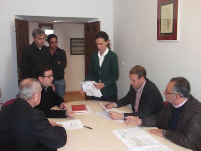 El Alcalde D Álvaro Lara, el sacerdote D. José Reinoso, el dorador Miguel Santana se dieron cita en el arzobispado con el vicario de zona D. Eduardo Vera Martín el pasado viernes 23 de marzo para firmar un convenio para la restauración del retablo de la ermita.