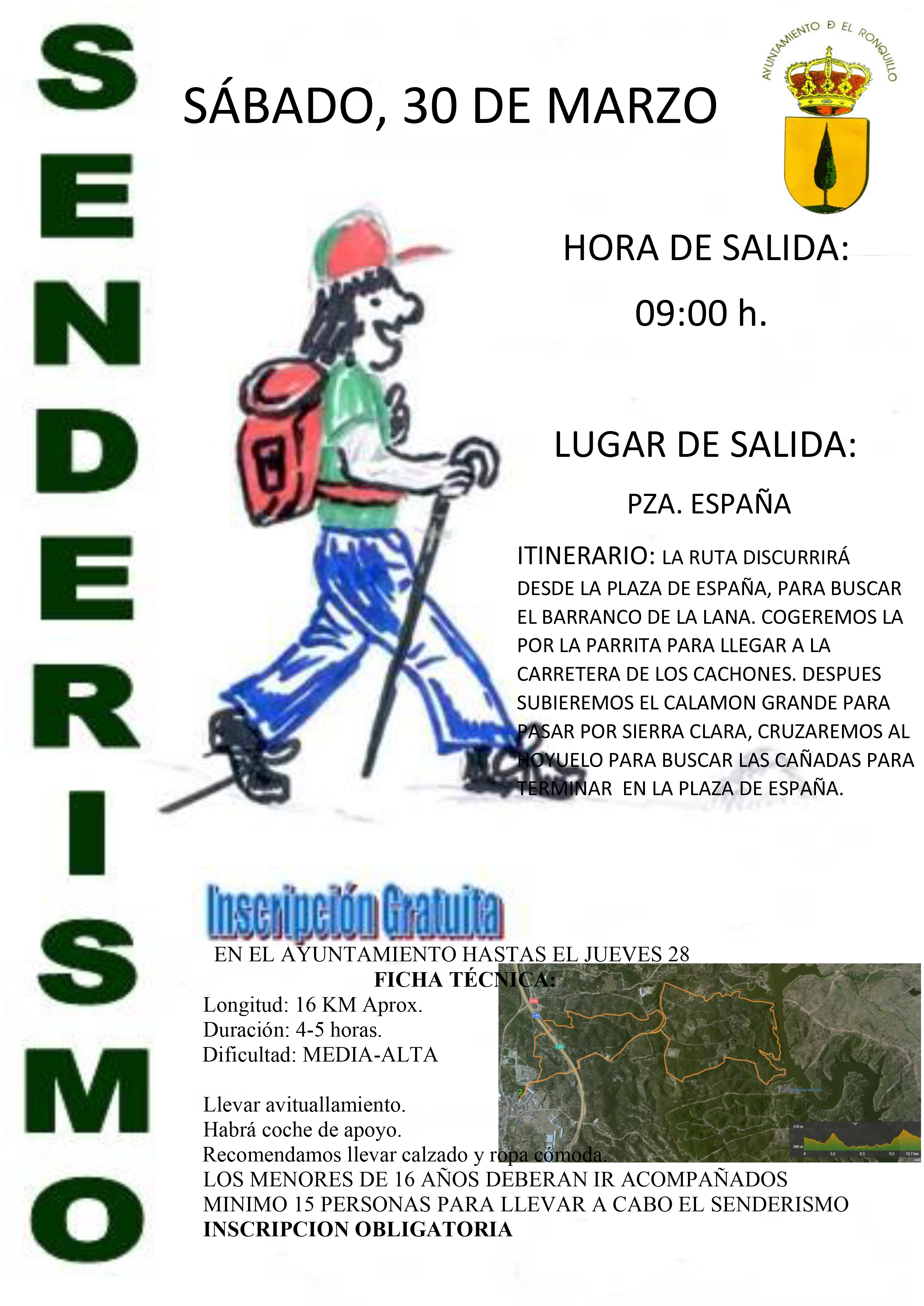 ITINERARIO: LA RUTA DISCURRIRÁ DESDE LA PLAZA DE ESPAÑA, PARA BUSCAR EL BARRANCO DE LA LANA. COGEREMOS LA POR LA PARRITA PARA LLEGAR A LA CARRETERA DE LOS CACHONES. DESPUÉS SUBIREMOS EL CALAMÓN GRANDE PARA PASAR POR SIERRA CLARA, CRUZAREMOS AL HOYUELO PARA BUSCAR LAS CAÑADAS PARA TERMINAR EN LA PLAZA DE ESPAÑA.
