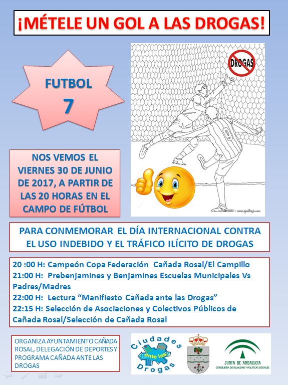 En Cañada Rosal, desde el programa Ciudad ante las Drogas, se preparan ya las actividades para conmemorar el día contra el abuso de drogas, que se celebró ayer 26 de junio. Así, el próximo jueves se llevará a cabo una Gymkana con los alumnos del proyecto Ribete, con el tabaco como tema central. Esos mismos alumnos han realizado un cartel conmemorativo de las octavas jornadas Cañada ante las drogas, cuyo ganador se conocerá también en estos días. El viernes 30 se llevará a cabo la actividad "Métele un gol a las drogas" que fomenta el deporte contra los hábitos no saludables. Durante este evento deportivo se leerá un manifiesto contra la droga. Desde el programa se invita a los carrosaleños a participar de estas actividades.
