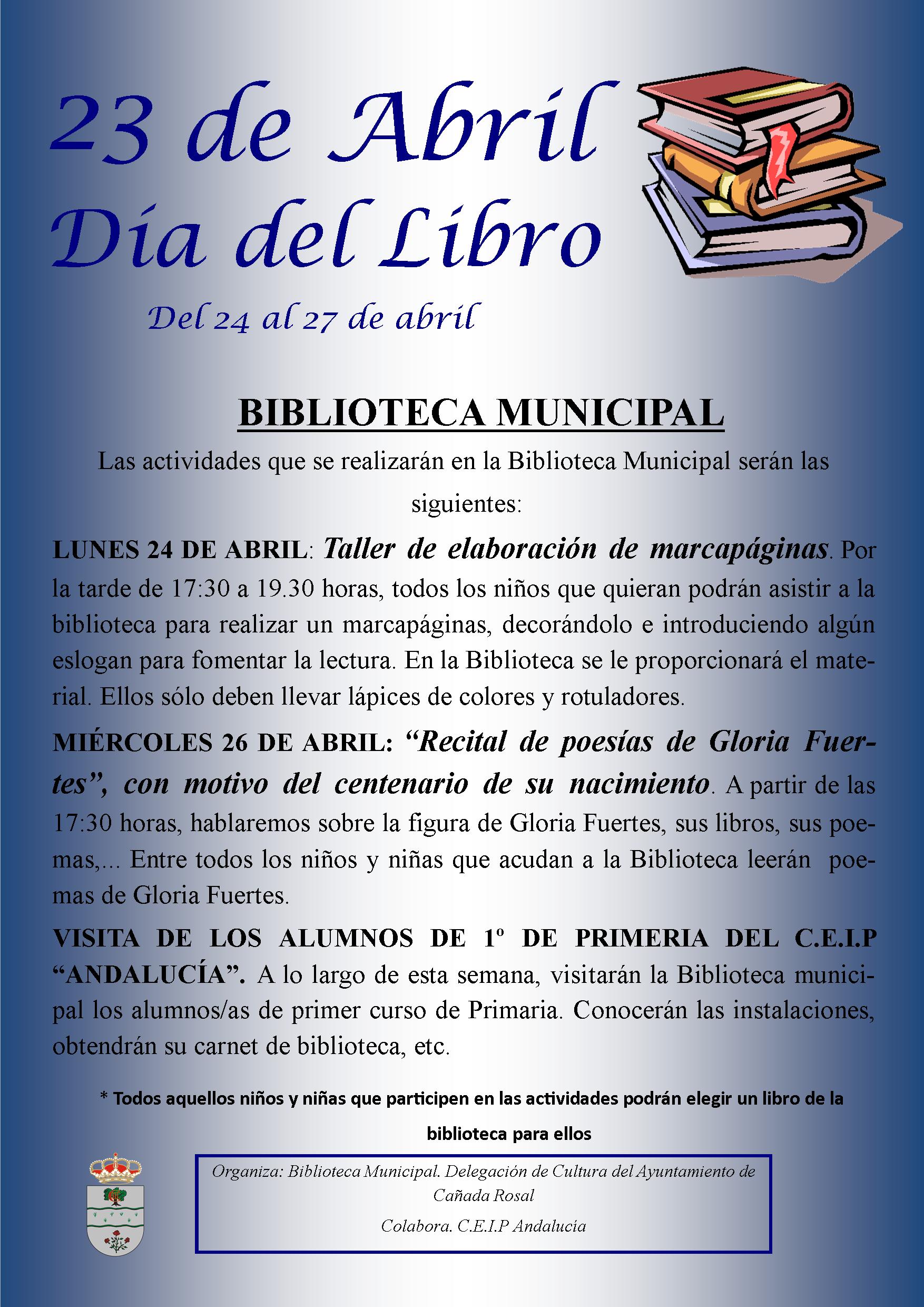Desde la delegación de Cultura del Ayuntamiento de Cañada Rosal, se ponen en marcha diversas actividades para conmemorará el día mundial del libro que se celebraba el pasado domingo 23 de abril. Talleres de marca páginas, recital de poesía en homenaje a Gloria Fuertes y visitas de los alumnos de primaria del CEIP Andalucía a las instalaciones de la Biblioteca Municipal, son algunas de las actividades organizadas para conmemorar el día del libro.