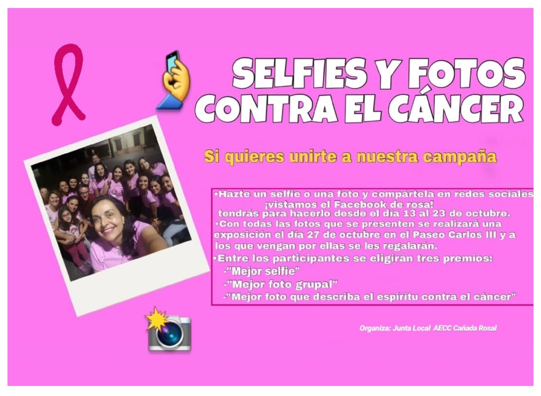 Además, durante varios días, la Junta Local ha ido recopilando fotografías de todos aquellos que han querido formar parte de esta actividad. Selfies o imágenes grupales que se han colgado en Facebook y se han compartido en redes. Bajo el lema "Contigo damos la cara". El próximo sábado, se expondrán todas esas fotografías impresas y se les darán a todos los que vayan a por ellas. Asimismo, se otorgarán tres premios, uno al "mejor selfie", otro " a la mejor foto grupal" y por último, "a la mejor fotografía que describe el espíritu contra el cáncer".