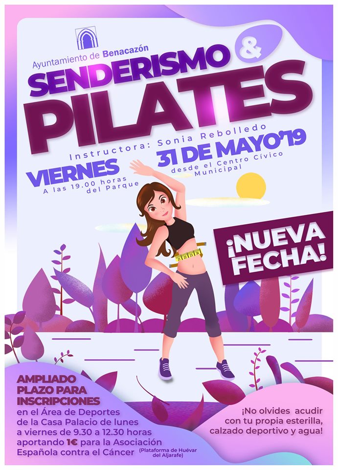 Esta actividad se iniciará desde el Centro Cívico para realizar un recorrido senderista de aproximadamente 6 kilómetros hasta el Mirador de la Cárcava. A su regreso, aproximadamente hora y media después, tendrá lugar una clase de Pilates al aire libre en el recinto del Parque Municipal. El Método Pilates es un entrenamiento deportivo que aglutina distintas especialidades como gimnasia, traumatología y yoga; uniendo el dinamismo y la fuerza muscular con el control postural, la respiración y la relajación. Se le atribuyen beneficios en la mejora de la postura, mejora de la flexibilidad, de la fuerza, de la coordinación y del equilibrio.