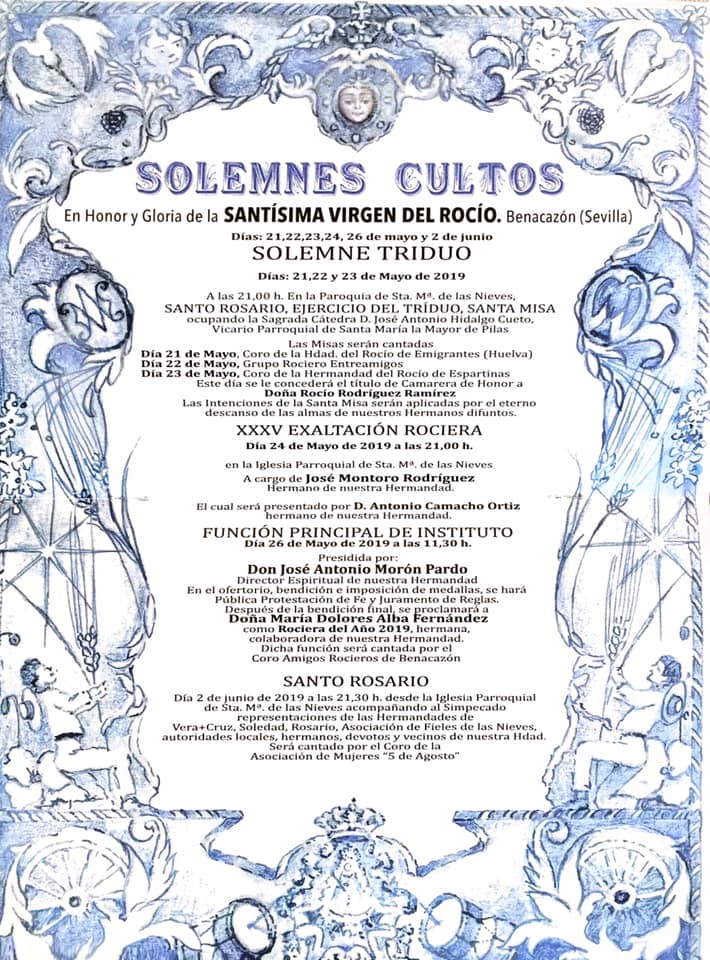 El ayuntamiento informa que el próximo viernes 24 de mayo tendrá lugar la XXXV Exaltación de la Hermandad del Rocío de Benacazón, que estará a cargo de D. José Montoro Rodríguez, presentado por D. Antonio Camacho Ortiz. El acto será a las 21:00 h. en la Iglesia Parroquial Santa María de las Nieves.
