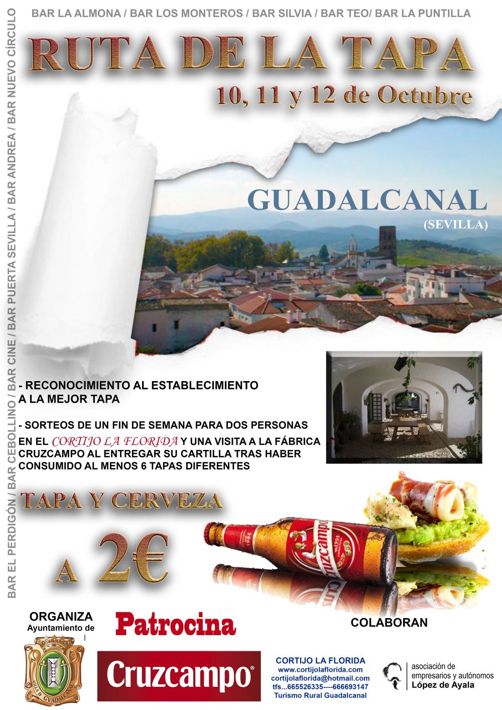 RUTA DE LA TAPA 2015 Los próximos días 10, 11 y 12 de octubre tendrá lugar en nuestra localidad la ruta de la tapa. Dicho evento se realizará por todos los establecimientos repostero de la localidad, los cuales ofrecerán tapa y cerveza a 2€. Todos los establecimientos presentarán una tapa, que tendrá que estar disponible en dicha ruta durante los días que dure dicho evento. Esta tapa será la que entre en concurso, pero podrán ofrecer otras tapas a precios asequibles. Premio para los comensales: Los usuarios llevarán cartillas con casillas, una por cada establecimiento, que serán selladas por cada bar tras degustar la tapa presentada a concurso. La cartilla cuenta con 12 casillas, una por bar. La cartilla al ser completada al menos en 6 de sus casillas por degustar las tapas en los diferentes establecimientos, entrarán en el sorteo de un fin de semana en una Casa Rural del Municipio. Sólo podrán entregar 2 cartillas por persona durante los tres días de la ruta de la tapa. Evaluación por los comensales: En cada cartilla presentada, se seleccionará cual es la tapa que más le ha gustado. Sólo entrarán en valoración las cartillas que estén completada al menos con seis establecimientos. Dichas valoraciones se registrarán en urnas para contabilizar el lunes 12 de Octubre para premiar al local con la mejor tapa. Habrá una urna por establecimiento. Reconocimiento a mejor tapa: Se reconocerá el local ganador con una placa o cartel conmemorativo, que deberá ser expuesto a las afueras del local, así mismo la tapa ganadora deberá de estar en la carta del establecimiento durante los próximos 12 meses. SOLICITA A LOS COLABORADORES: · El regalo al ganador del sorteo: Fin de Semana en una casa Rural (La casa rural se le hará publicidad en la Cartilla de las Tapas) · La placa para el local ganador. A cargo de la Asociación de Empresarios y Autónomos López de Ayala. · Bono de sellar, con publicidad de los establecimientos colaboradores y la Asociación de Empresarios y Autónomos López de Ayala y la casa Casa Rural Cortijo de la Florida. · Patrocina Cruzcampo: - 1 barril de cerveza por establecimiento colaborador. - Visita VIP a las instalaciones de Heineken Sevilla a la fábrica cruzcampo.