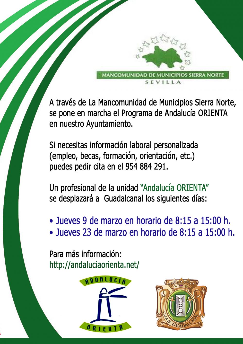 Si necesitas información laboral personalizada (empleo, becas, formación, orientación, etc.) puedes pedir cita en el 954 884 291. . Un profesional de la unidad "Andalucía ORIENTA" se desplazará a Guadalcanal los siguientes días: • Jueves 9 de marzo en horario de 8:15 a 15:00 h. • Jueves 23 de marzo en horario de 8:15 a 15:00 h. . Para más información: http://andaluciaorienta.net/Imagen
