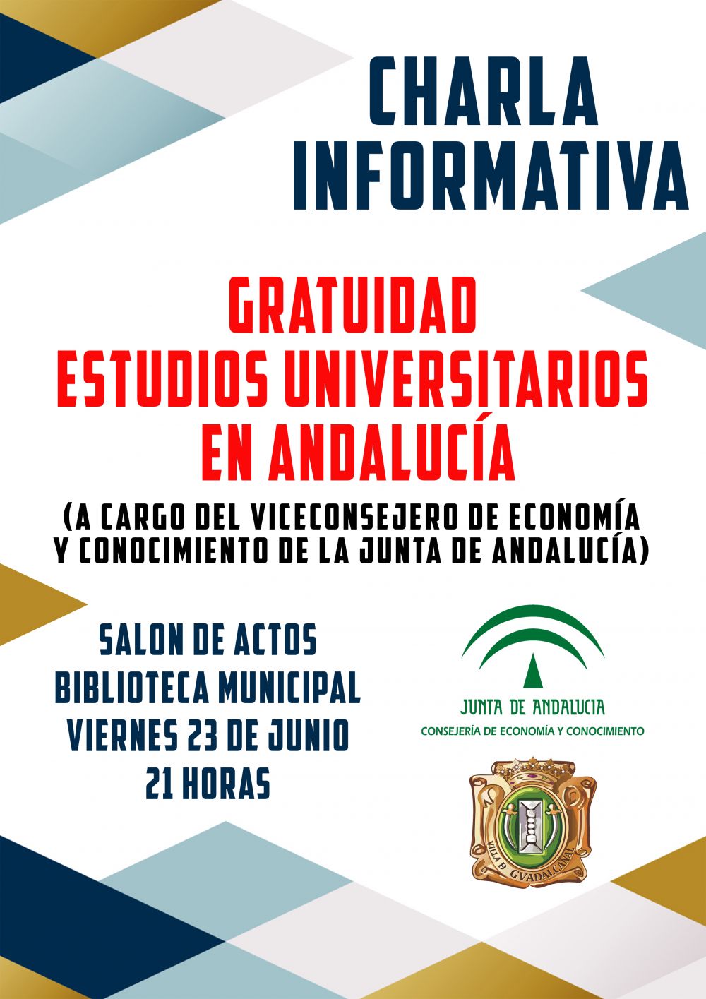 . Cha rla informativa a cargo del Viceconsejero de Economía y Conocimiento de la Junta de Anadalucía .Andalucía pondrá en marcha a partir del próximo curso, una bonificación del 99% del coste de cada asignatura con el único requisito de haber aprobado previamente otra asignatura, sin tener en cuenta el nivel de renta. . Se tratarán temas importantes para las familias con hijos que estén o vayan a cursar estudios universitarios en nuestra comunidad autónoma.