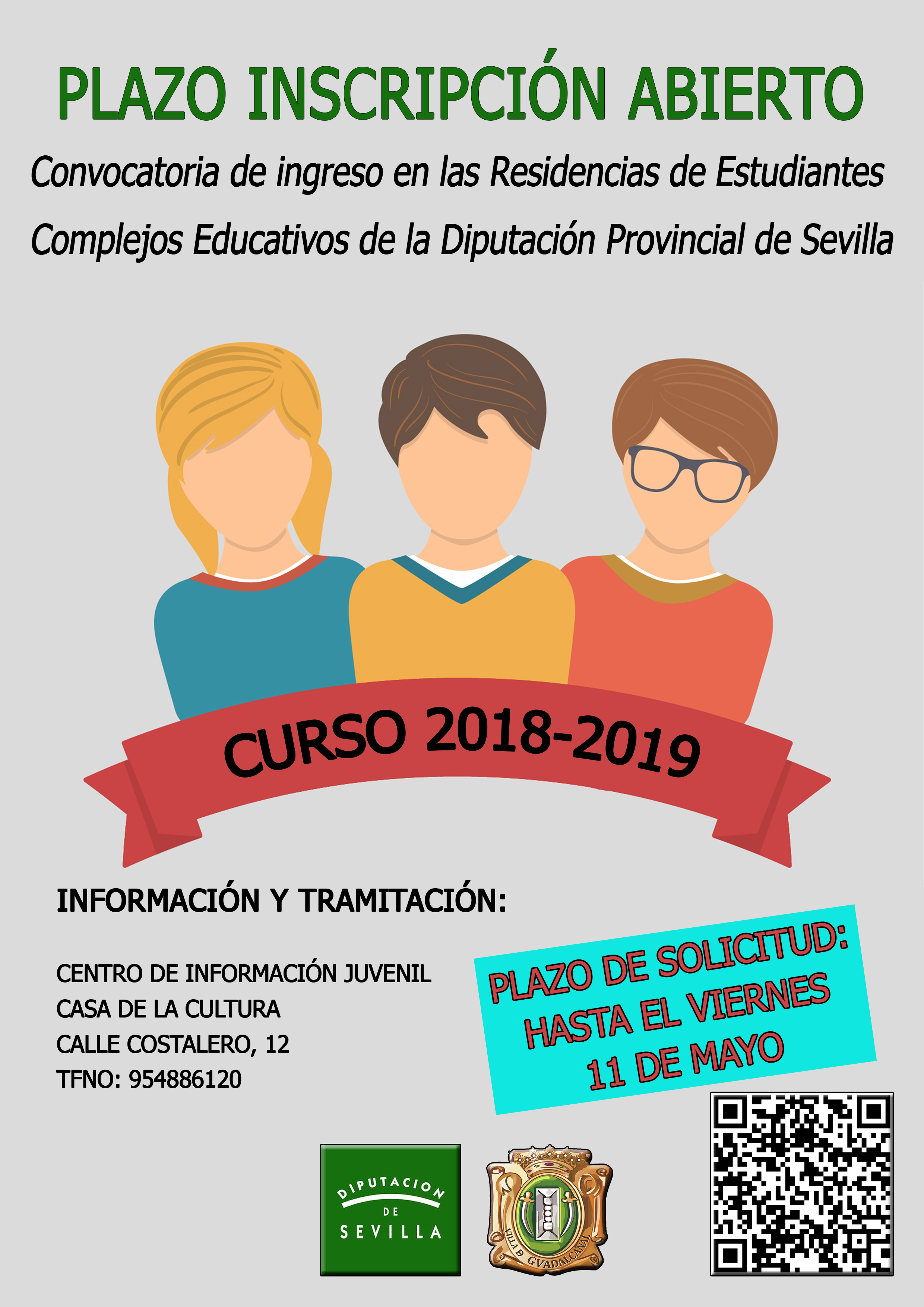 - La Diputación de Sevilla convoca plazas, en régimen mixto, en las residencias de los Complejos Educativos Provinciales destinadas a quienes vayan a realizar durante el curso escolar 2018-2019 estudios de ciclos formativos de grado medio y superior o estudios universitarios de grado, y que, teniendo domicilio familiar (el de los padres o tutores legales del solicitante) en cualquier municipio de la provincia de Sevilla, reúnan los requisitos de estudios exigidos en la legislación vigente.