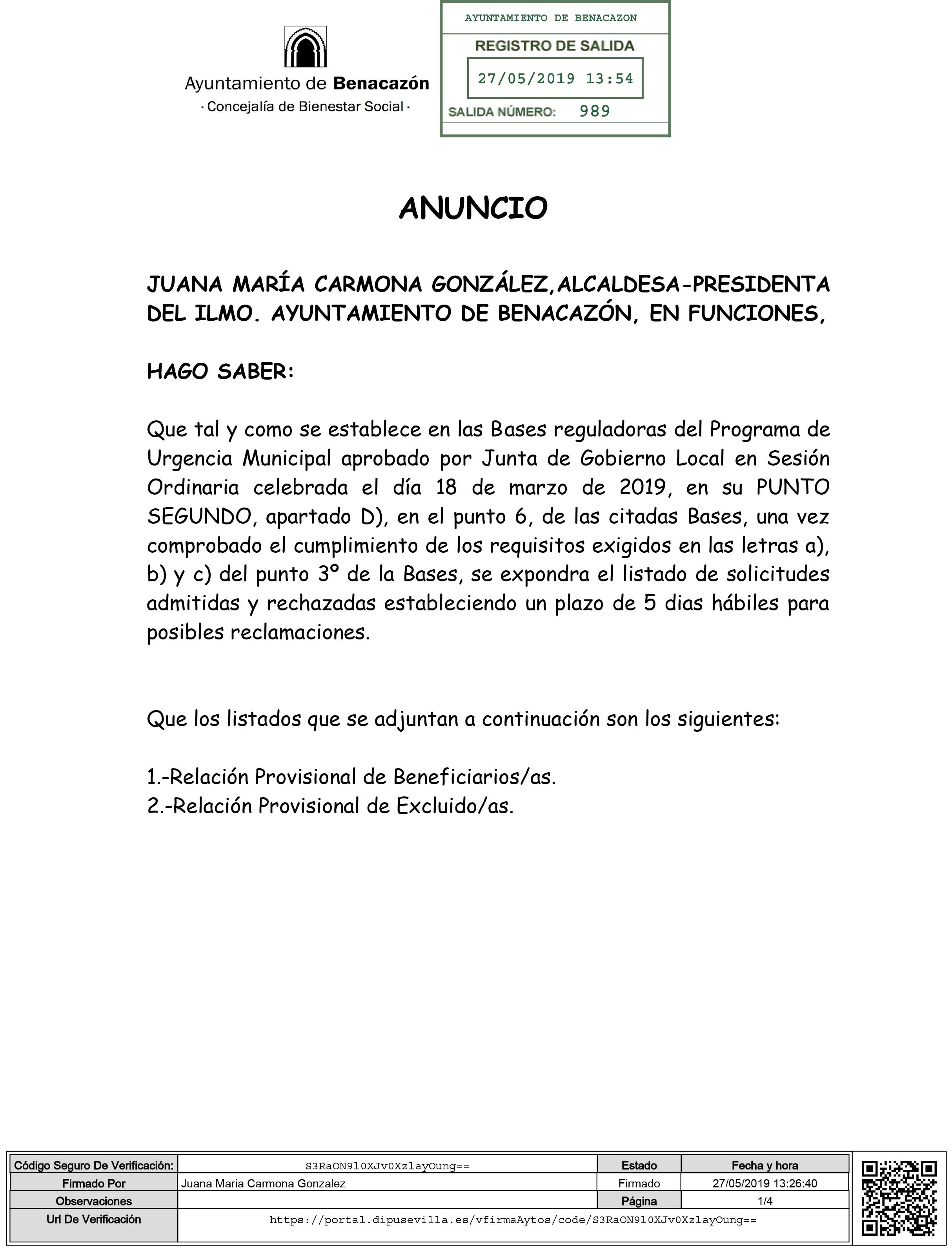 Desde el Ayuntamiento de Benacazón te informamos de que, tal y como se establece en las Bases reguladoras del Programa de Urgencia Municipal aprobado por Junta de Gobierno Local en Sesión Ordinaria celebrada el día 18 de marzo de 2019, en su Punto Segundo, apartado D), en el punto 6 de las citadas Bases, "una vez comprobado el cumplimiento de los requisitos exigidos en las letras a), b) y c) del punto 3º de la Bases, se expondrá el listado de solicitudes admitidas y rechazadas estableciendo un plazo de 5 días hábiles para posibles reclamaciones".