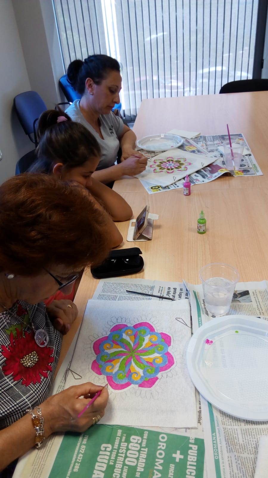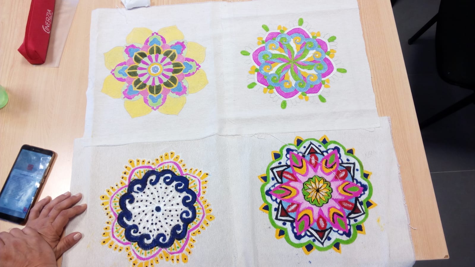 Esta formación se ha estructurado en dos partes: una teórica en la que se ha explicado a las participantes una breve historia y definición de los mandalas; y una segunda, que se ha centrado más en la práctica, poniendo a prueba las habilidades y destreza en el uso de esta técnica, utilizando telas y pinceles.