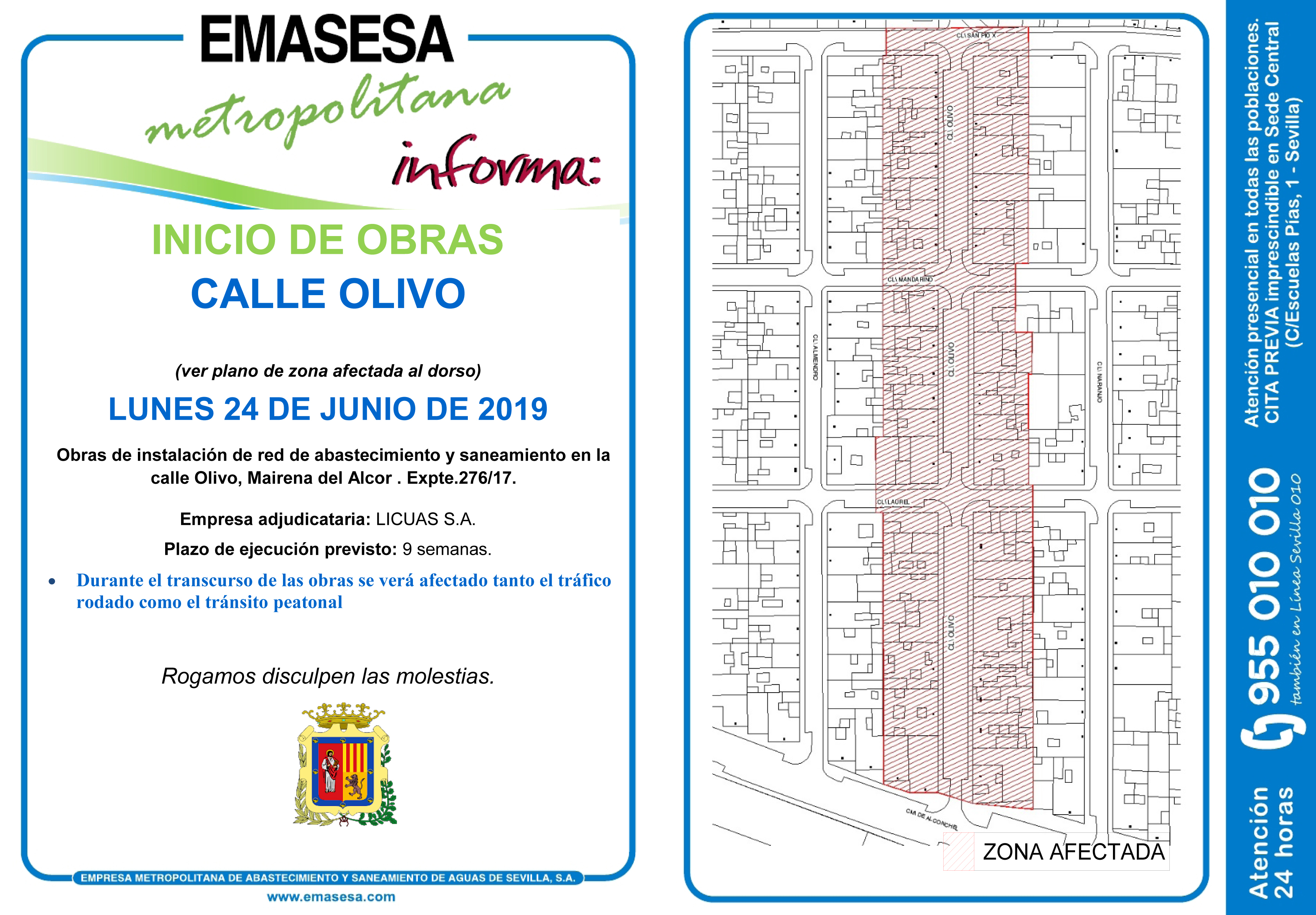 El Ayuntamiento de Mairena del Alcor anuncia un nuevo inicio de obra en la barriada la Checa. El lunes 24 de junio comenzarán las obras de Emasesa para la instalación de la red de abastecimiento y saneamiento en la calle Olivo. Esta actuación adjudicada a la empresa Licuas SA, tiene una duración estimada de 9 semanas. Durante ese tiempo se verá afectado tanto el tráfico rodado como el tránsito peatonal, por lo que se ruega a los vecinos disculpen las molestias que esta intervención pudiera causar.