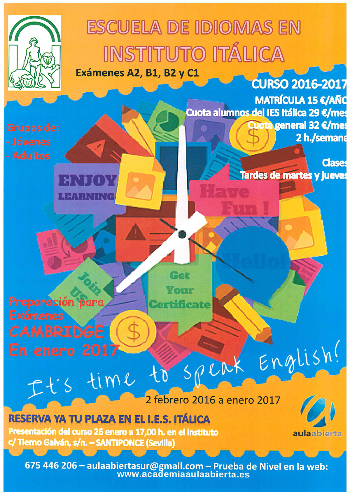 Imagen Ubicación Categoría noticia Educación Mostrar en el carrusel de la sección No Fecha Lun, 25/01/2016 - 19:23 Más información http://www.santiponce.es/es/actualidad/noticias/Escuela-de-Idiomas-en-IES-Itali…