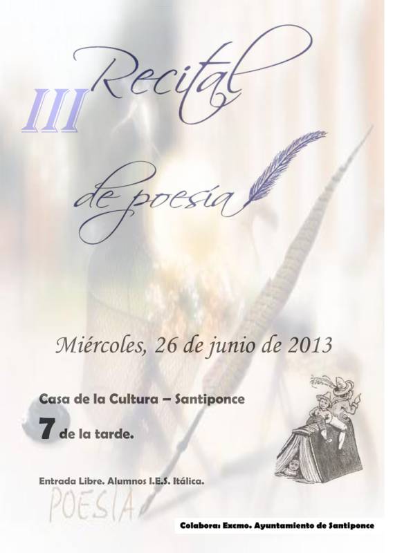 Imagen Ubicación Categoría noticia Educación Mostrar en el carrusel de la sección No Fecha Mié, 19/06/2013 - 17:51 Más información http://www.santiponce.es/es/actualidad/noticias/III-Recital-de-Poesia/