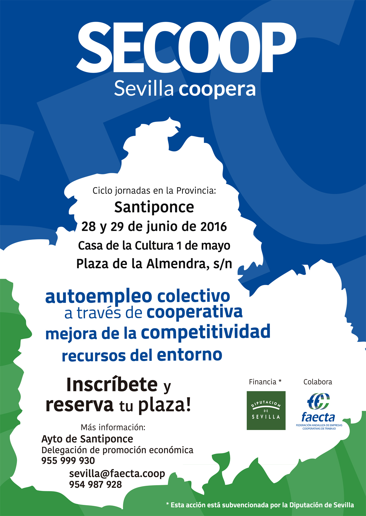 El proyecto SECOOP es una iniciativa subvencionada por la Diputación Provincial de Sevilla, con la que FAECTA pretende fomentar el emprendimiento colectivo, contribuir a la creación de cooperativas de trabajo y mejorar la competitividad de proyectos empresariales en municipios rurales de la provincia de Sevilla.