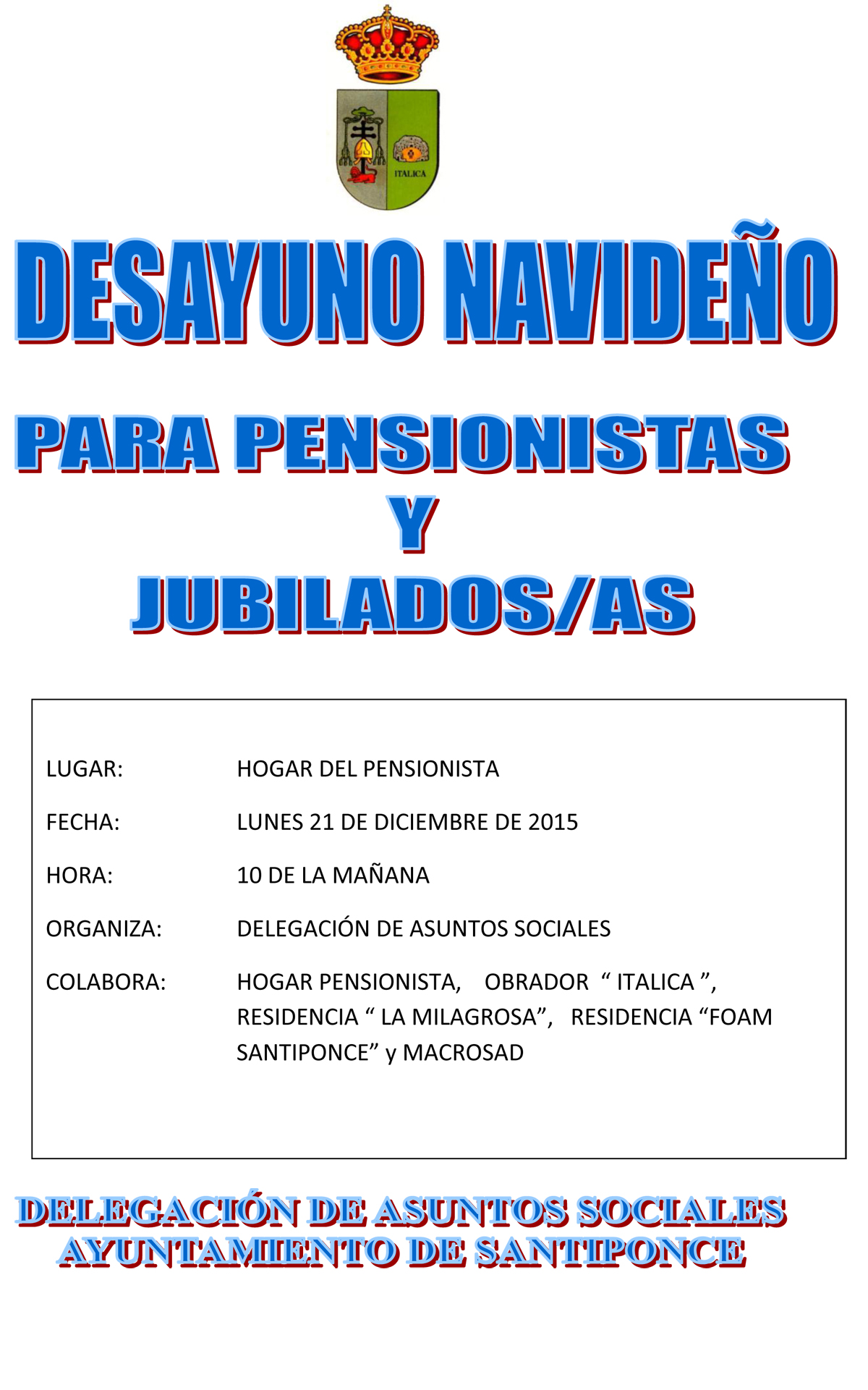 Imagen Ubicación Categoría noticia Asuntos Sociales Mostrar en el carrusel de la sección No Fecha Vie, 18/12/2015 - 18:33 Más información http://www.santiponce.es/es/actualidad/noticias/Desayuno-Navideno-para-pensioni…