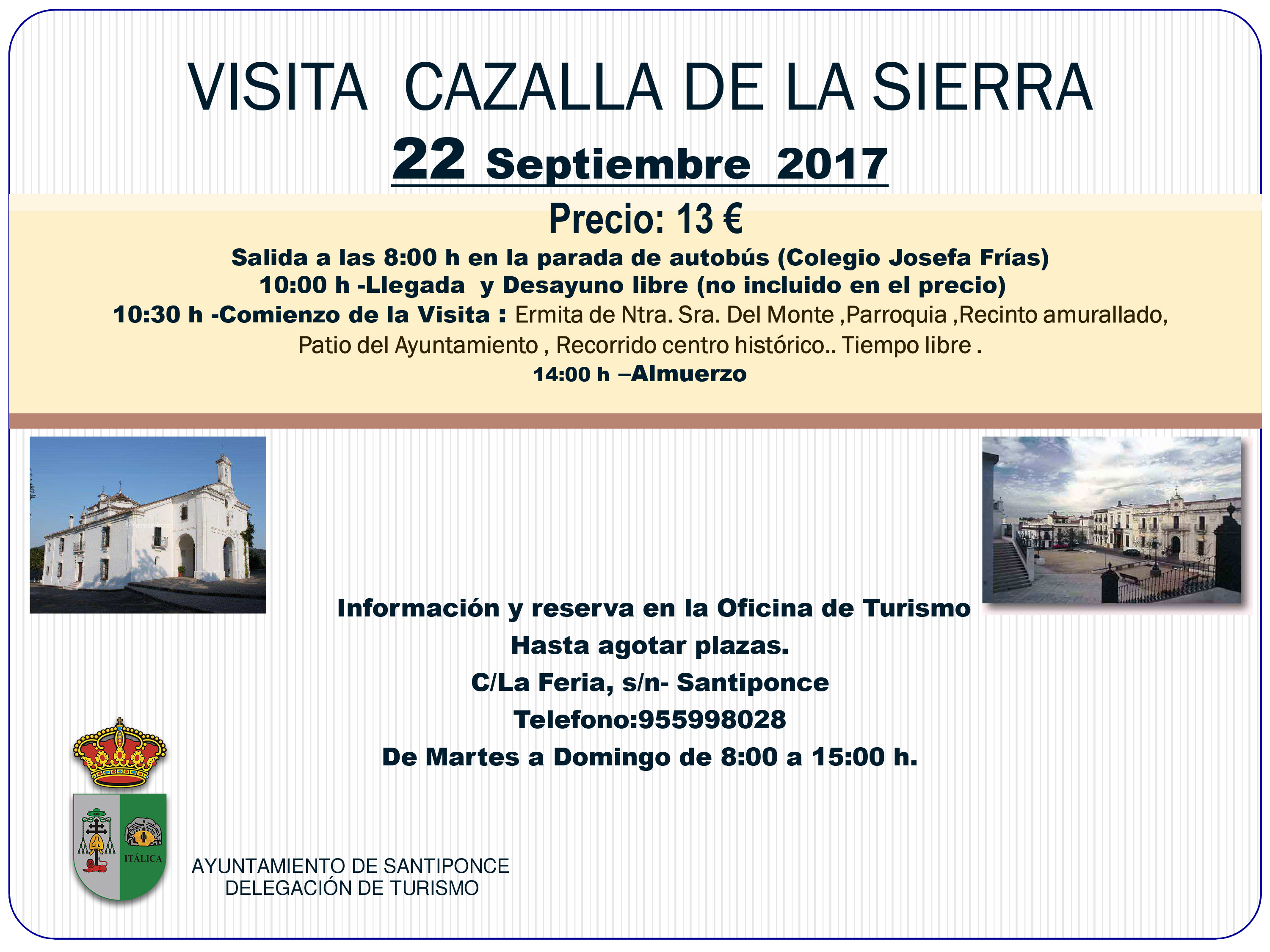 Imagen Ubicación Categoría noticia Turismo Mostrar en el carrusel de la sección No Fecha Mié, 30/08/2017 - 13:09 Más información http://www.santiponce.es/es/actualidad/noticias/Visita-Cazalla-de-la-Sierra/