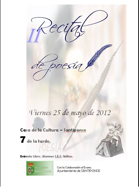 Imagen Ubicación Categoría noticia Educación Mostrar en el carrusel de la sección No Fecha Mar, 22/05/2012 - 18:30 Más información http://www.santiponce.es/es/actualidad/noticias/II-Recital-de-Poesia/