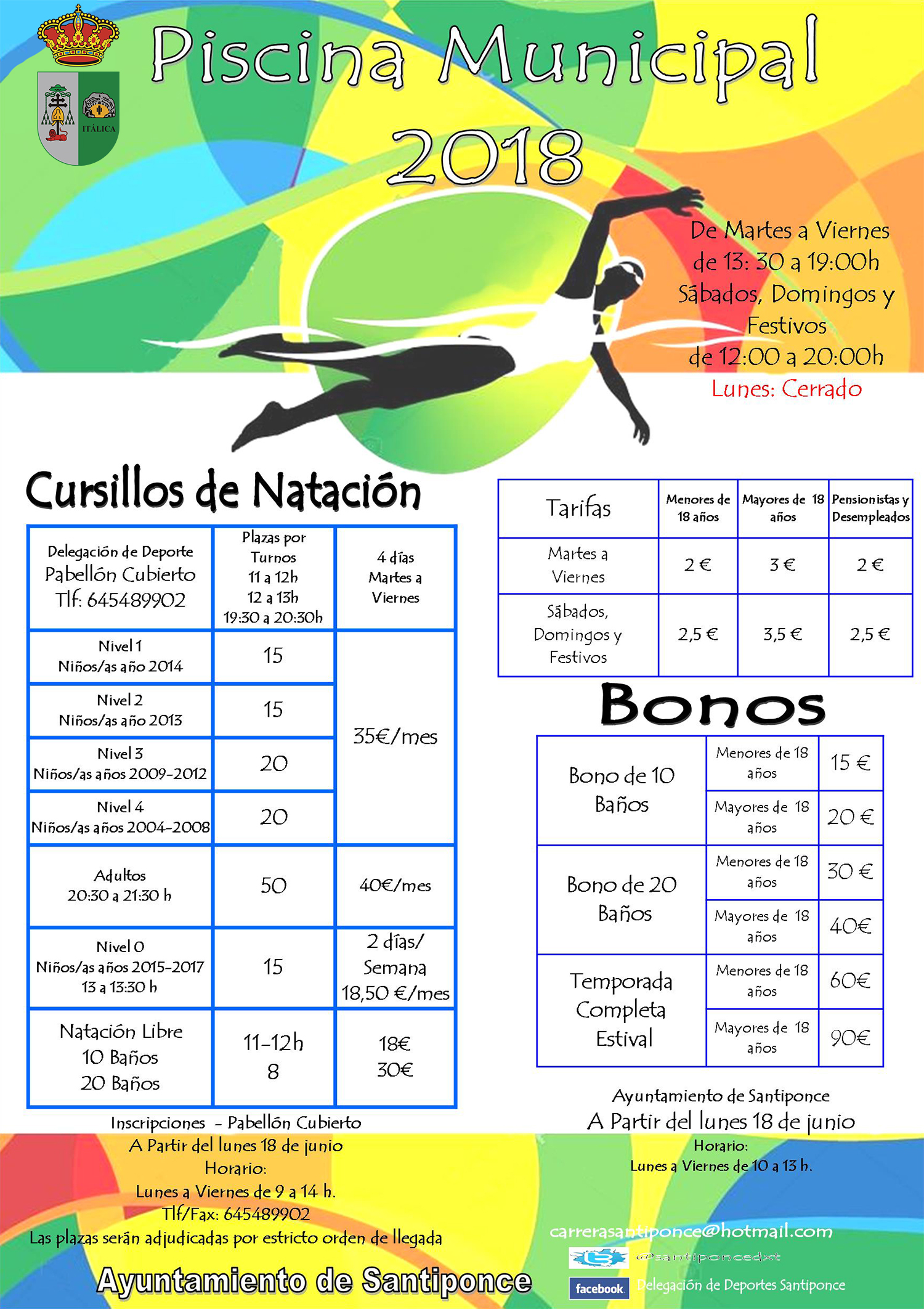 Imagen Ubicación Categoría noticia Deporte Mostrar en el carrusel de la sección No Fecha Mié, 13/06/2018 - 13:02 Más información http://www.santiponce.es/es/actualidad/noticias/Piscina-Municipal-2018/