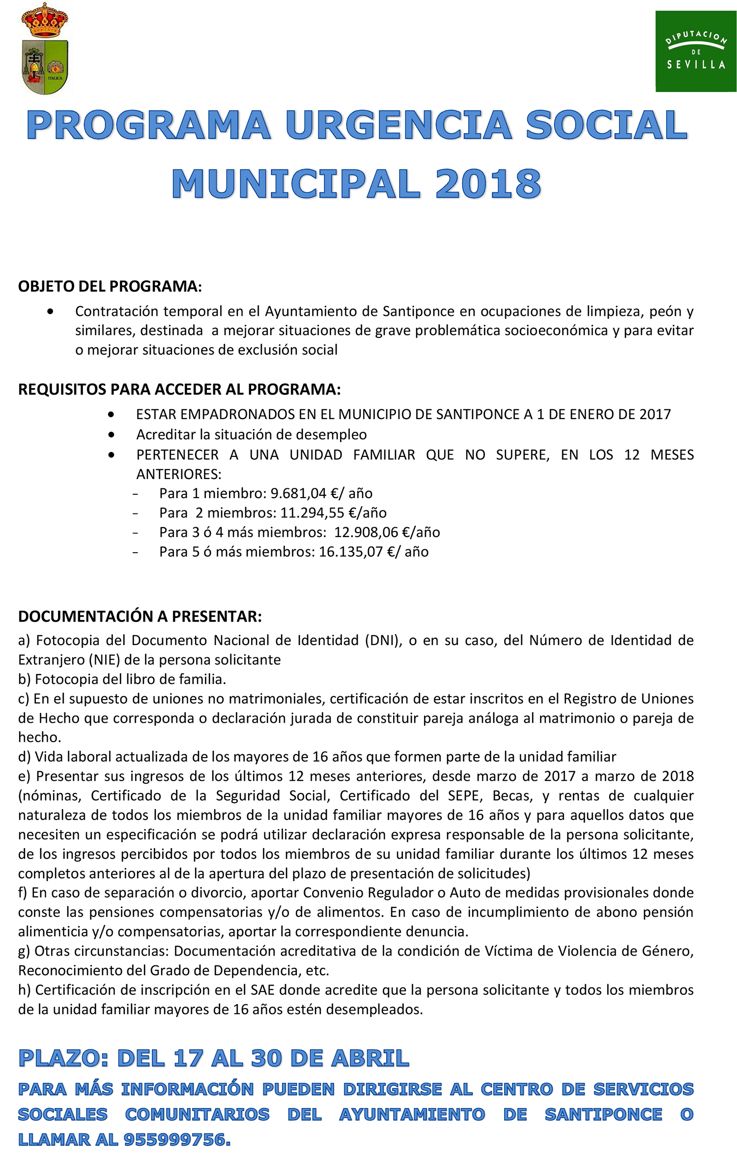 Centro de Servicios Sociales Comunitarios del Ayuntamiento de Santiponce o llamar al teléfono