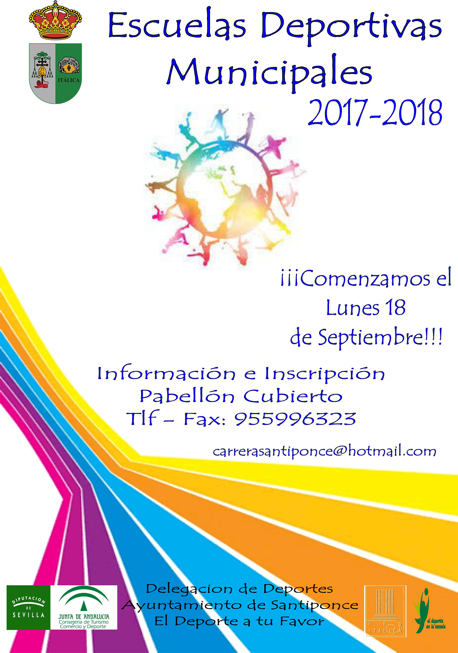 Imagen Ubicación Categoría noticia Deporte Mostrar en el carrusel de la sección No Fecha Dom, 10/09/2017 - 13:22 Más información http://www.santiponce.es/es/actualidad/noticias/Escuelas-Deportivas-municipales…