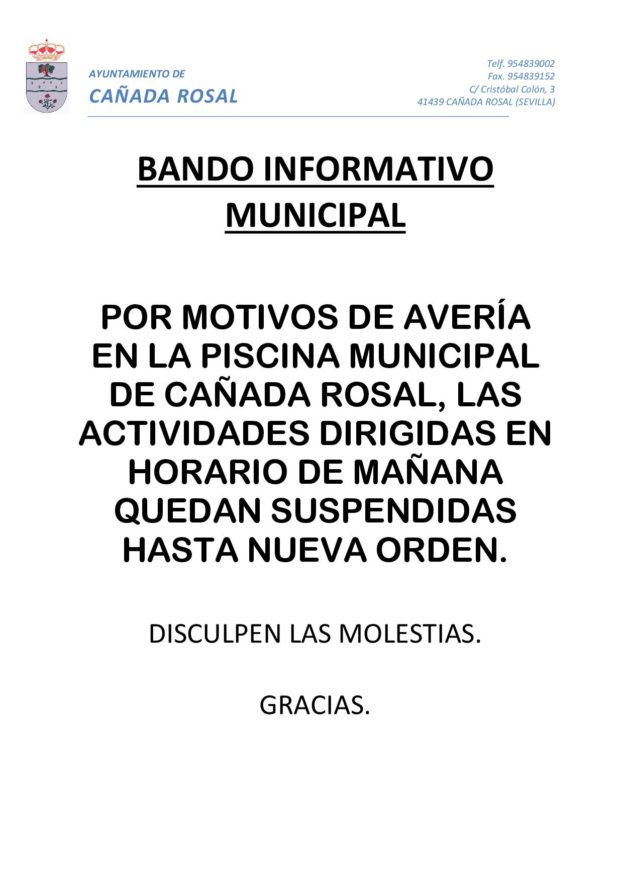 POR MOTIVOS DE AVERÍA EN LA PISCINA MUNICIPAL DE CAÑADA ROSAL, LAS ACTIVIDADES DIRIGIDAS EN HORARIO DE MAÑANA QUEDAN SUSPENDIDAS HASTA NUEVA ORDEN.