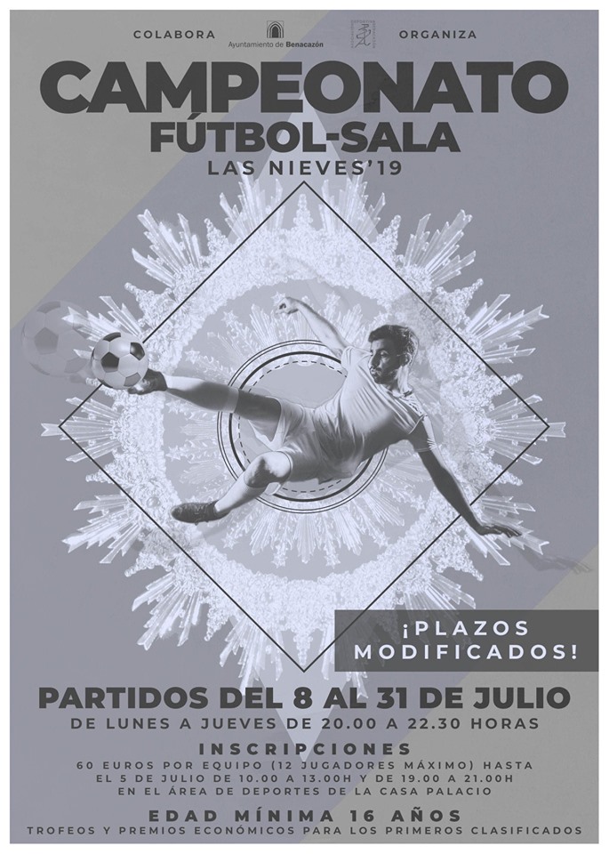 Al ampliar su plazo, los partidos se desarrollarán entre el lunes 8 y el 31 de julio de 2019, de lunes a jueves de 20.00 a 22.30 horas. Este campeonato dispone de premios económicos (en función de la cantidad de equipos inscritos; 50% para el primer clasificado, 30% para el segundo clasificado y 20% para el tercer clasificado) y trofeos para el máximo goleador y para el portero menos goleado. El Campeonato de Fútbol-Sala de Las Nieves 2019 está organizado por la Asociación Deportiva Benacazón, con la colaboración del Área de Deportes del Ayuntamiento.