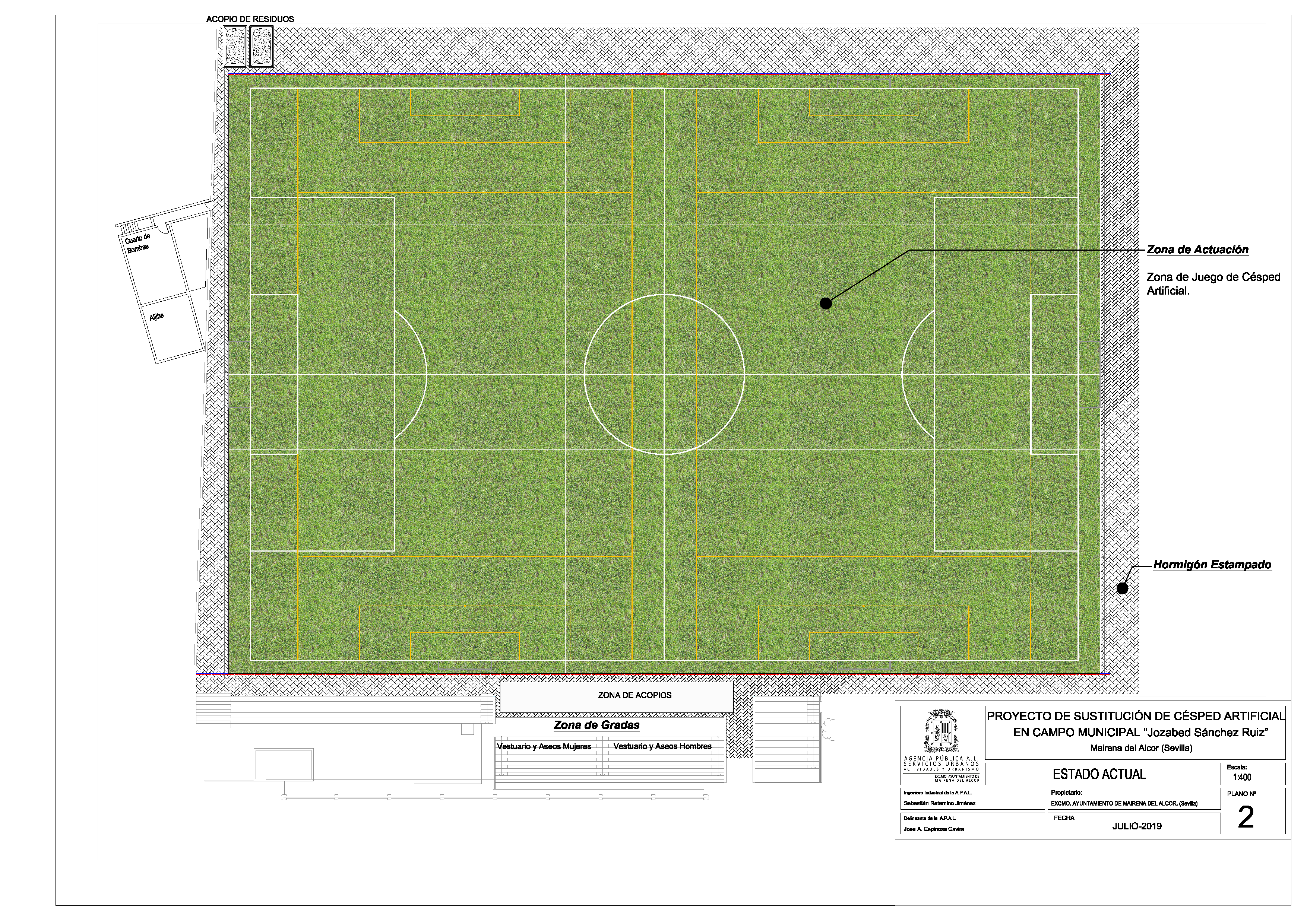 En el colegio Juan Caraballo se acometerá la reforma del patio y de los núcleos de aseos ubicados en la primera planta del edificio. Por último, en el Campo de Fútbol Jozabed Sánchez Ruiz se procederá a la sustitución del césped artificial por otro con certificado homologado por la FIFA Quality con una longitud de hoja de 50 mm. Además, se sustituirá el sistema de riego, garantizando la totalidad de superficie del campo, así como también se harán intervenciones que mejoren la seguridad del mismo.