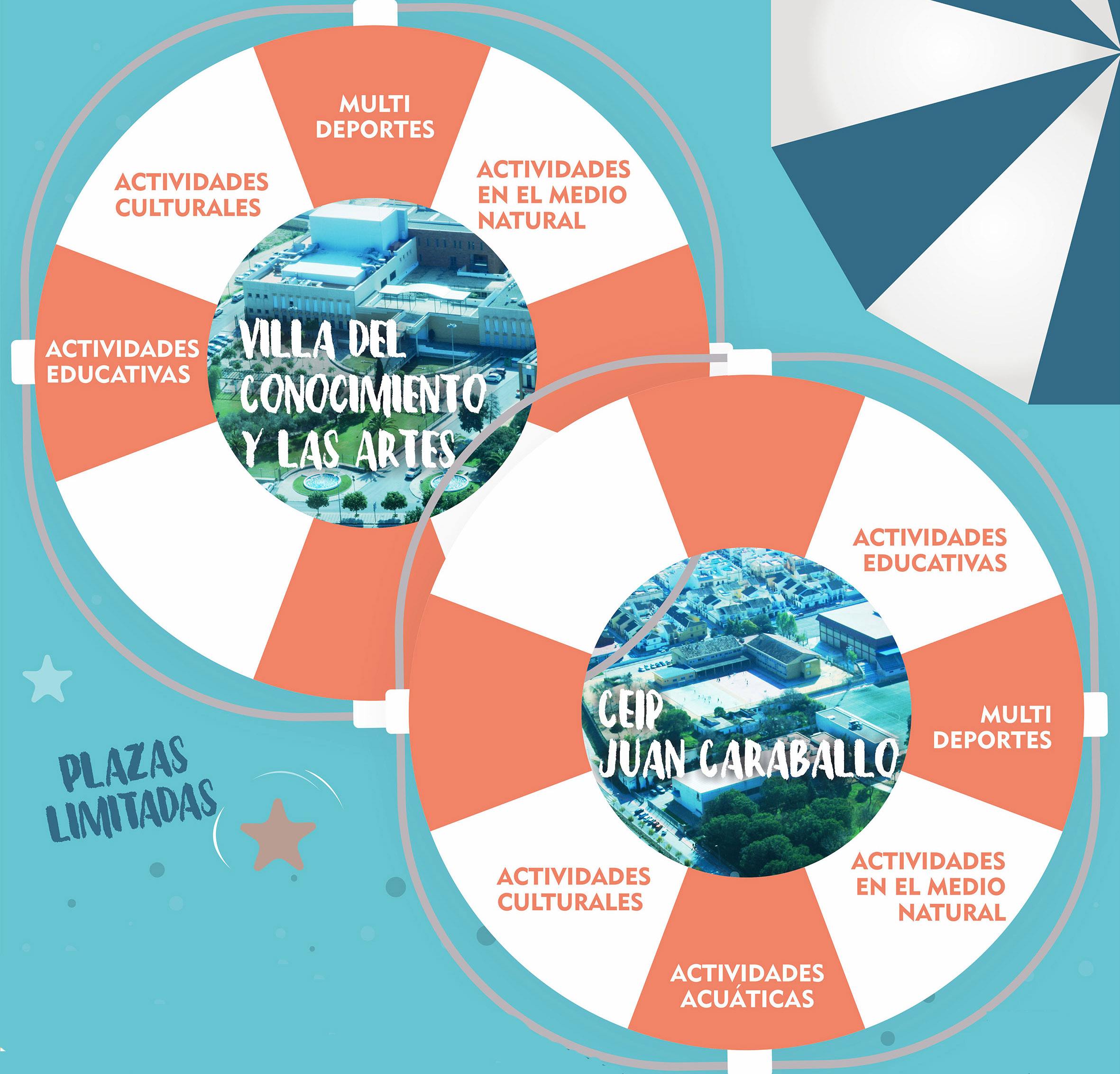 En cada una de las sedes se imparte un programa específico de actividades, multideportes, actividades acuáticas, en el medio natural, culturales y educativas en el colegio Juan Caraballo. Actividades culturales, educativas, en el medio natural y multideportes en la Villa del Conocimiento y las Artes. Las plazas son limitadas.