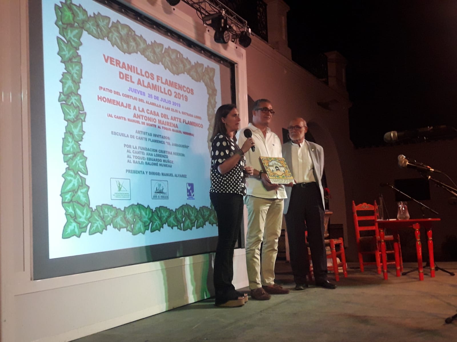 El patio del Cortijo del Alamillo acogió la noche del pasado jueves 25 de julio el homenaje a la Casa del Arte Flamenco Antonio Mairena. Forma parte del programa Veranillos Flamencos del Alamillo 2019, organizados por el propio parque del Alamillo que está gestionado por la Consejería de Fomento, Infraestructuras y Ordenación del Territorio a través de la Agencia de Vivienda y Rehabilitación de Andalucía (AVRA), con la colaboración de entidades como la Asociación de Amigos del Alamillo y la Fundación Cristina Heeren.