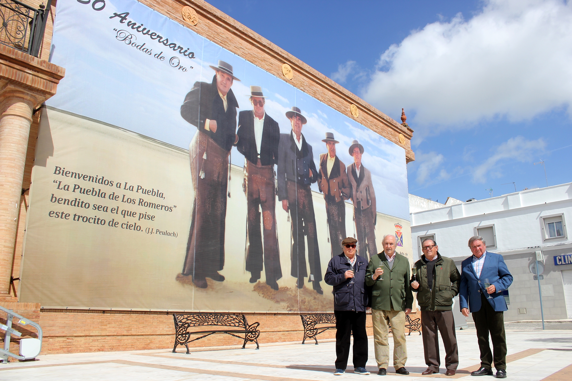 El cartel ha sido inaugurado este lunes por Los Romeros de La Puebla , que han posado junto al