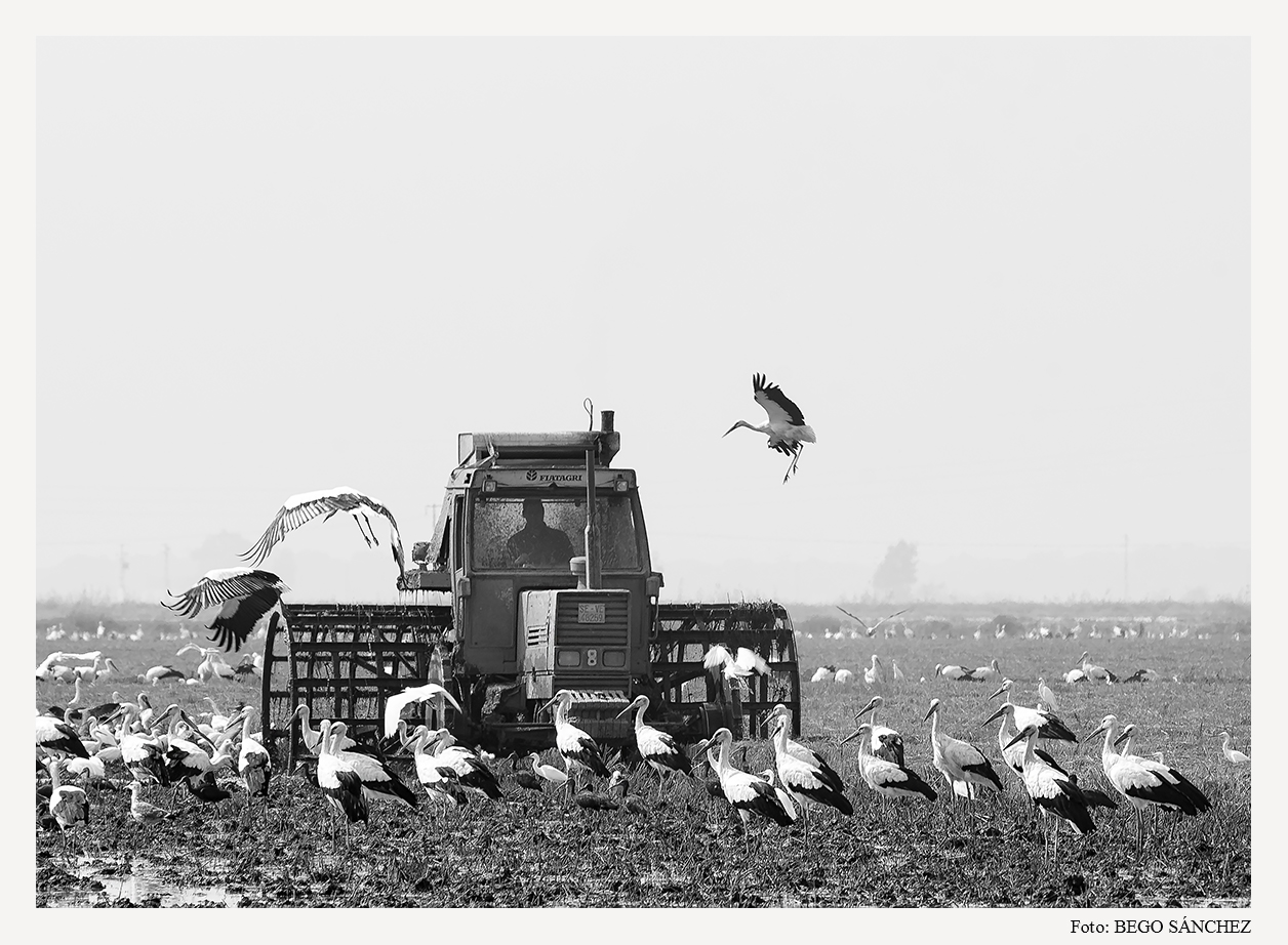 Fue en octubre de 2013 cuando Bego Sánchez visitó por primera vez los arrozales del bajo Guadalquivir, en la provincia de Sevilla. Descubrió una tierra muy diferente, un cultivo que desconocía y un ecosistema en el que las aves hacen las delicias de los amantes de la Naturaleza. En aquél tiempo iniciaba su andadura en fotografía, pero ya sintió el profundo anhelo de poder documentar la cosecha de este cereal, el arroz.