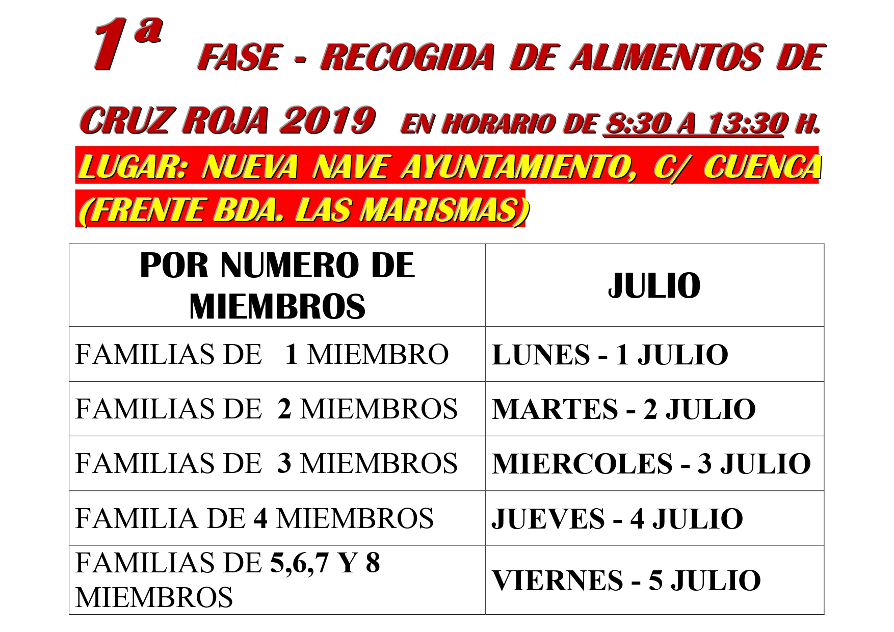 La mayor novedad del reparto reside en el lugar del mismo, ya que se producirá en la nueva nave del Ayuntamiento que está situada en la calle Cuenca, frente a la Barriada de las Marismas. El horario será de 08:30 a 13:30 horas, con el siguiente orden de reparto: