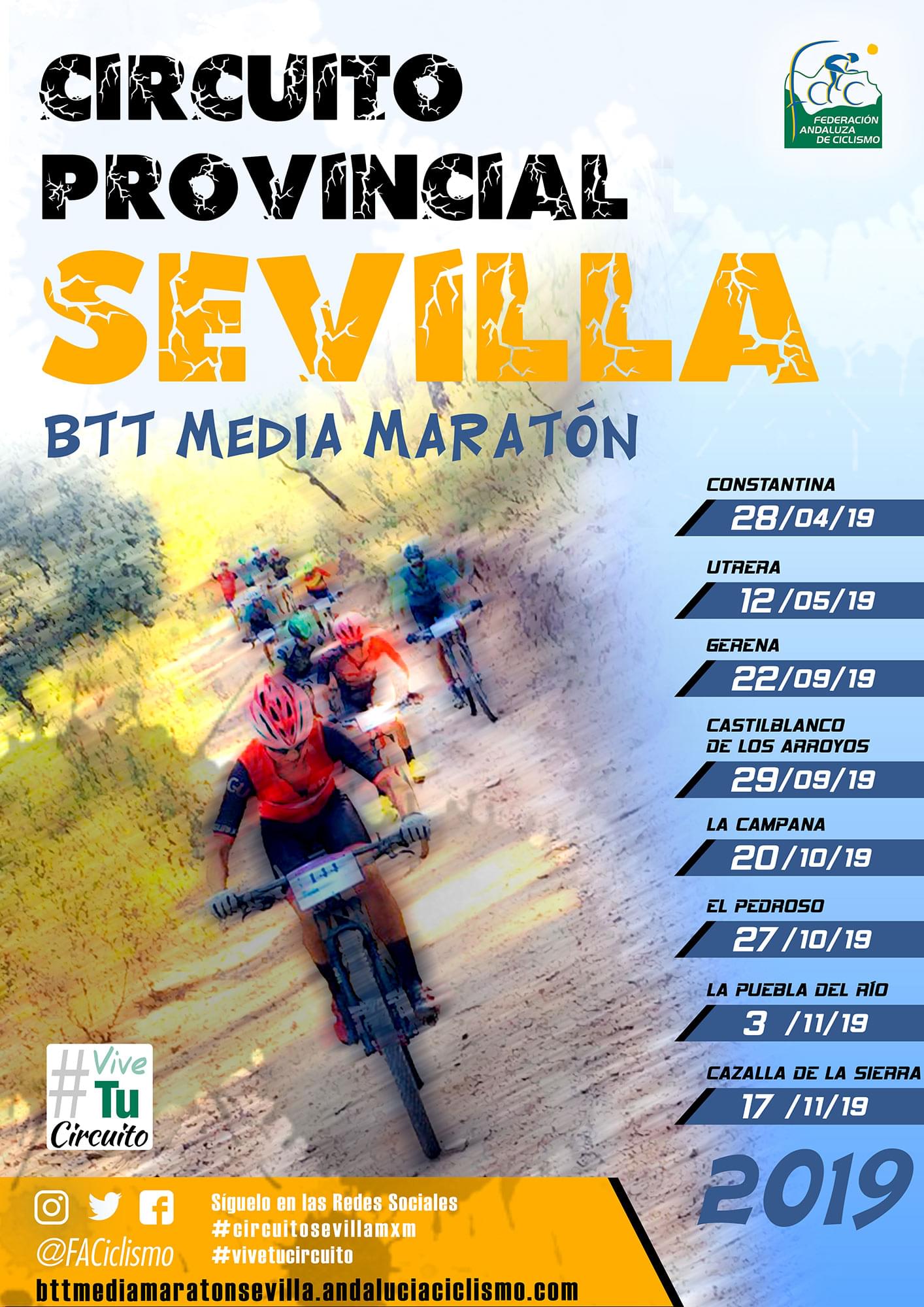 La provincia sevillana volverá a tener esta temporada 2019 un amplio circuito de medias maratones que ofrecerá a los bikers andaluces pruebas de exigencia media en entornos paisajísticos excepcionales. El Circuito Provincial de Sevilla de BTT Media Maratón 2019 ampliará este año su cartel, llegando a sumar hasta ocho pruebas que arrancarán el 28 de abril en Constantina. Utrera tomará el testigo en mayo para luego reanudar la actividad en septiembre en Gerena. Castilblanco de los Arroyos, La Campana, El Pedroso, La Puebla del Río serán las siguientes sedes dejando la prueba definitiva para noviembre en Cazalla de la Sierra.