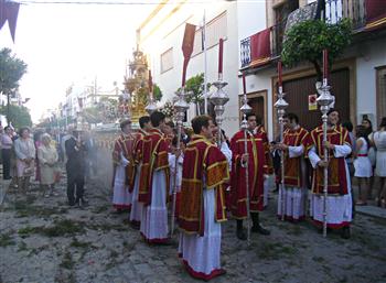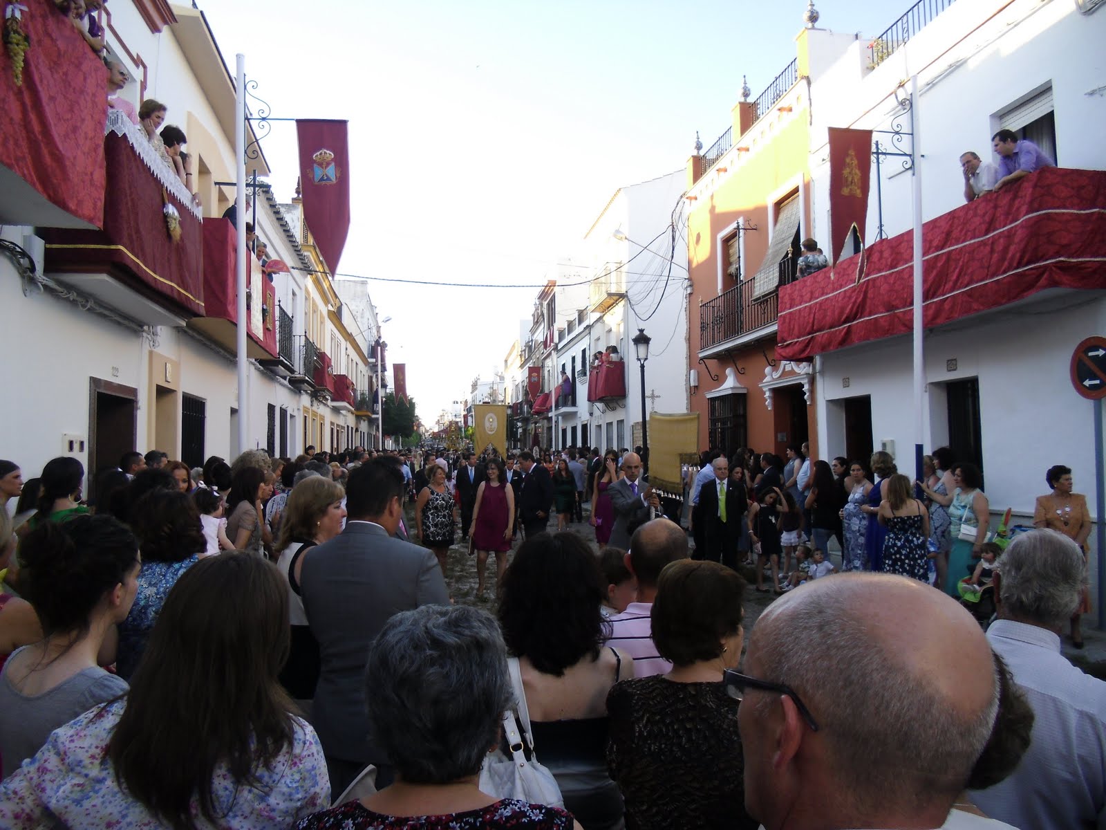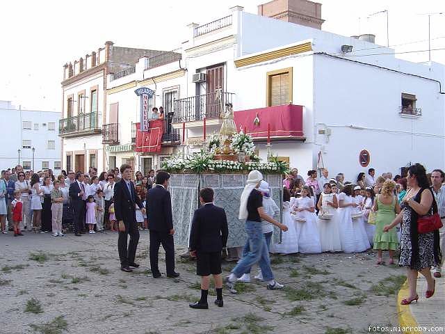 Pero será a partir de los años veinte cuando, de la mano de un cigarrero ejemplar, Don Manuel Campos Silgado (conocido familiarmente como Manolito Campos el del âGarrotalâ, y que durante muchos años fue Hermano Mayor de la Sacramental), la Hermandad alcanzó gran auge, ulteriormente mantenido por los que le siguieron, entre ellos, su sobrino, D. Manuel Fernández Campos, Ingeniero Director de la CompañÃa Sevillana de Electricidad. Fueron en esos años cuando llega a materializarse un Corpus más entrañable y en los que el pueblo entero comenzó a vivir y a celebrar ânuestra fiestaâ por excelencia. Los campos quedaban en reposo, y desde los más lejanos confines de las marismas sus hombres emprendÃan el camino hacia el pueblo â"siendo, en muchos casos, la única vez que lo visitaban en el año-; los caserÃos se despoblaban, y en el Cortijo Nuevo, la Isleta, Rojas, Casas Reales, Rubiales, El Mármol, el Cortijo de los Pobres, la Marmoleja, el Cogujón, Puñana, la Huerta del Cojo, Los Olivillos, La Abundancia, la Veta de la Palma,⦠no quedaba nadie. Esos hombres, esos trabajadores â"a veces, familias enteras- venÃan por veredas, sendas y caminos, y entraban por El Caramanchón, la Cuesta Colorá, El Pozo Concejo, El Callejón de la Arbolea, el Camino de las Tapias, la Barqueta; algunos, que tenÃan su aposento en el âotro laoâ del rÃo, lo atravesaban en una barquilla, y desde el muelle se dirigÃan a la cuesta de las âPalmillasâ, hasta llegar a su vivienda.
