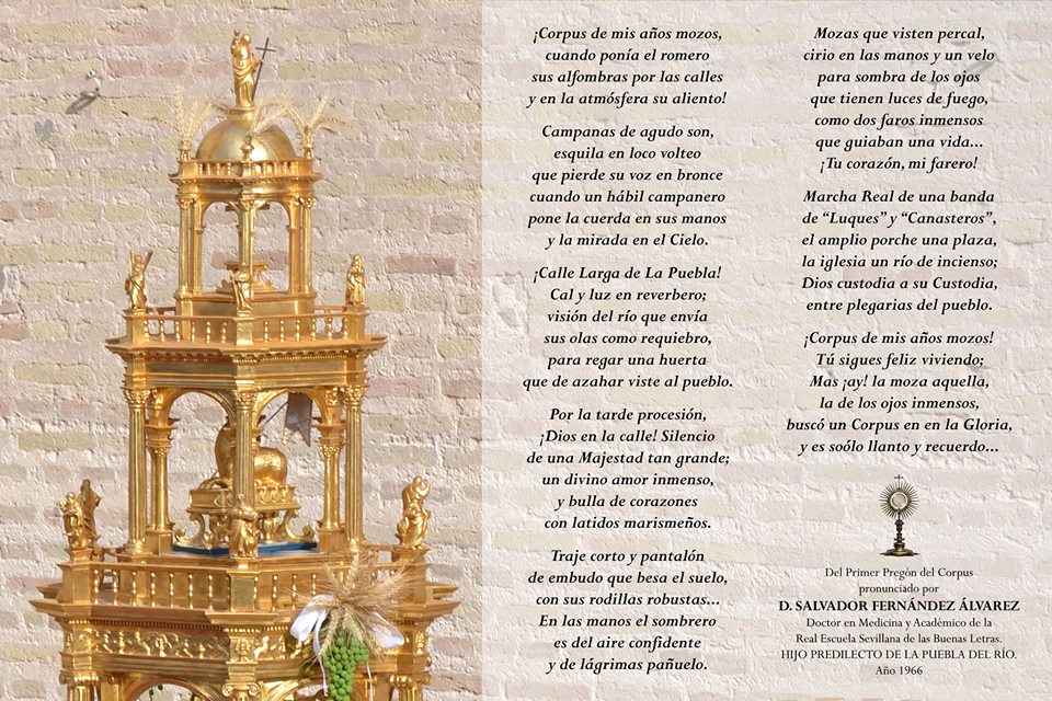 Sin embargo, hay una, "El Corpus", que quizás por ser la más antigua en el tiempo, esté más arraigada y la sintamos todos por igual. Efectivamente, en Puebla se vive âporâ y âparaâ las fiestas del Corpus: el año se divide en dos, un antes y un después del Corpus; la limpieza y blanqueado se hacen en el Corpus; la ropa se estrena por el Corpus; el hombre marismeño se desplazaba antiguamente a La Puebla por el Corpus; los que a causa de su trabajo viven fuera, vienen por el Corpus; y nuestra localidad tiene una cierta fama gracias a la "procesión del Corpus". Momento éste, el de la procesión, que nos llena a todos de orgullo, de nostalgia, de recuerdos de seres queridos que ya no están entre nosotros y, ¡como no!, de alegrÃa. El Corpus, pues, es el referente de todos los acontecimientos que suceden en nuestro pueblo. Con la fiesta del Corpus, pues, La Puebla alcanza su momento álgido, y por mucho que haya cambiado a través del tiempo, nuestros sentimientos se mantienen imperecederos cuando llega âel dÃaâ y vemos la Custodia en las calles cubiertas de romero. Nos vienen a la mente, por tanto, recuerdos, imágenes, vivencias, nostalgia de otros Corpus, de otros tiempos, de otras formas de vivirlos, como nos ha venido a la memoria al recordar conversaciones oÃdas de niño a nuestros mayores y de algunos testimonios encontrados en artÃculos o pregones hallados en esa hemeroteca tan especial que son los antiguos âlibros del Corpusâ, que, desde 1949, se vienen publicando año tras año.