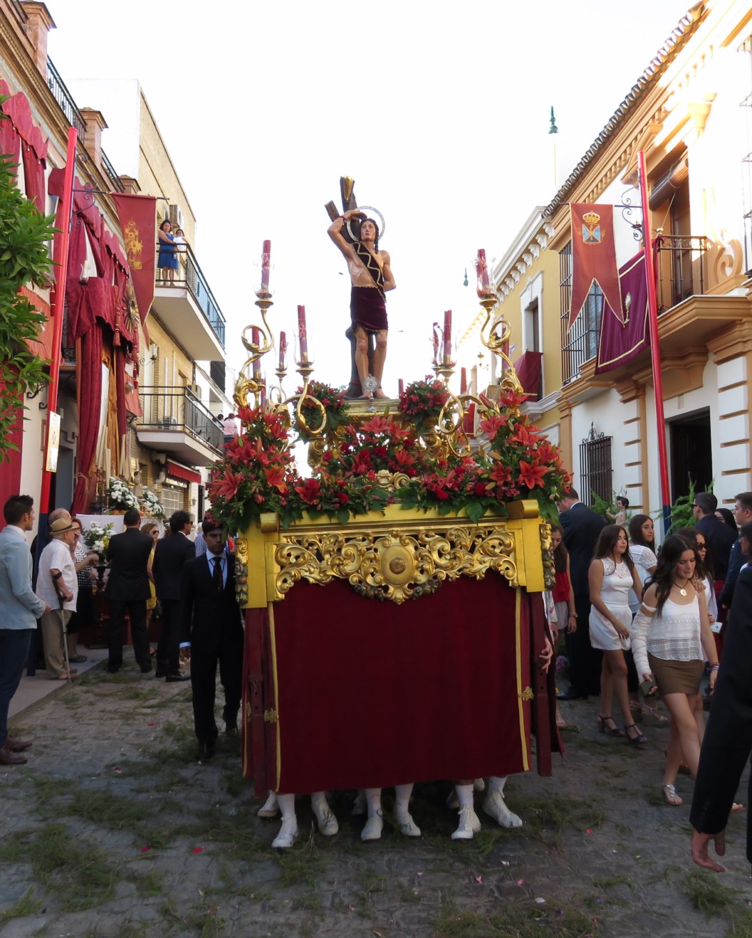 Empieza el desfile en medio de un silencio impresionante y enfila la calle Miro hacia el Santo, y, nada más comenzar, desde la Hacienda cae sobre la Custodia una lluvia de flores; al llegar a la estacadilla de Campos, se divisa, por primera vez, el rÃo a través del olivar; e inmediatamente la procesión pasa junto a unas humildes chozas, de las que sus moradores han salido a la puerta y esperan arrodillados y llenos de respeto; se oye una campanita y un desgarrado cohete que supone el comienzo de unos fuegos de artificio: se ha llegado a la Capilla. Parón, descanso de los costaleros y entrada en la calle Larga; nuevo silencio y recogimiento, como muy bien supo recoger el poeta: