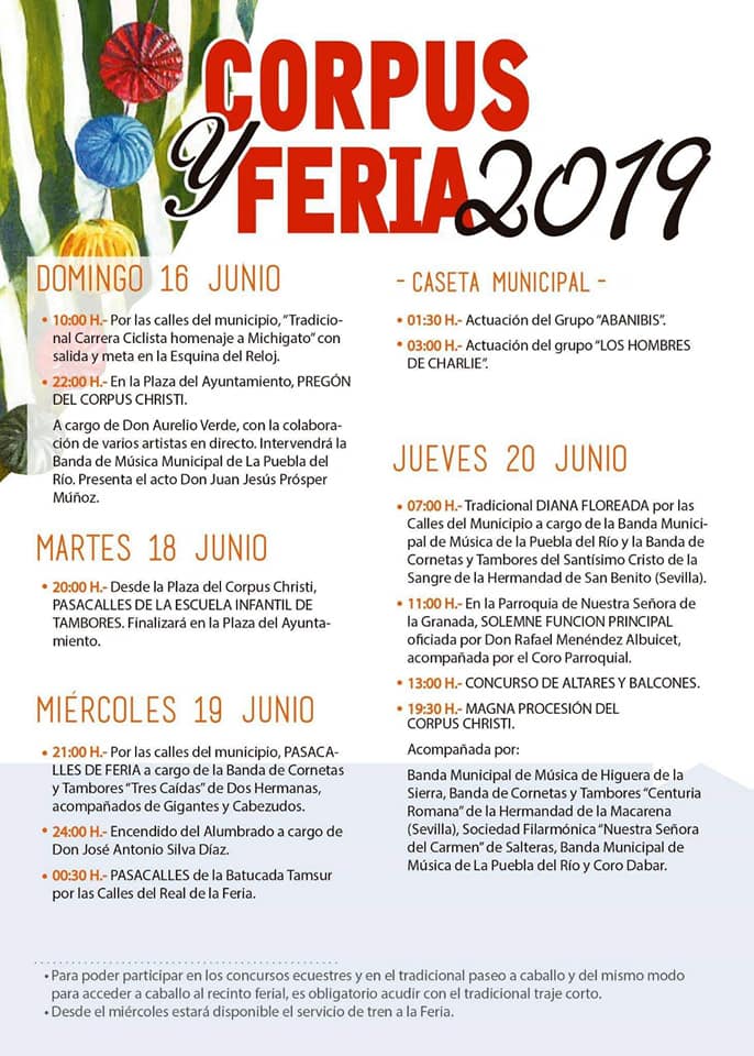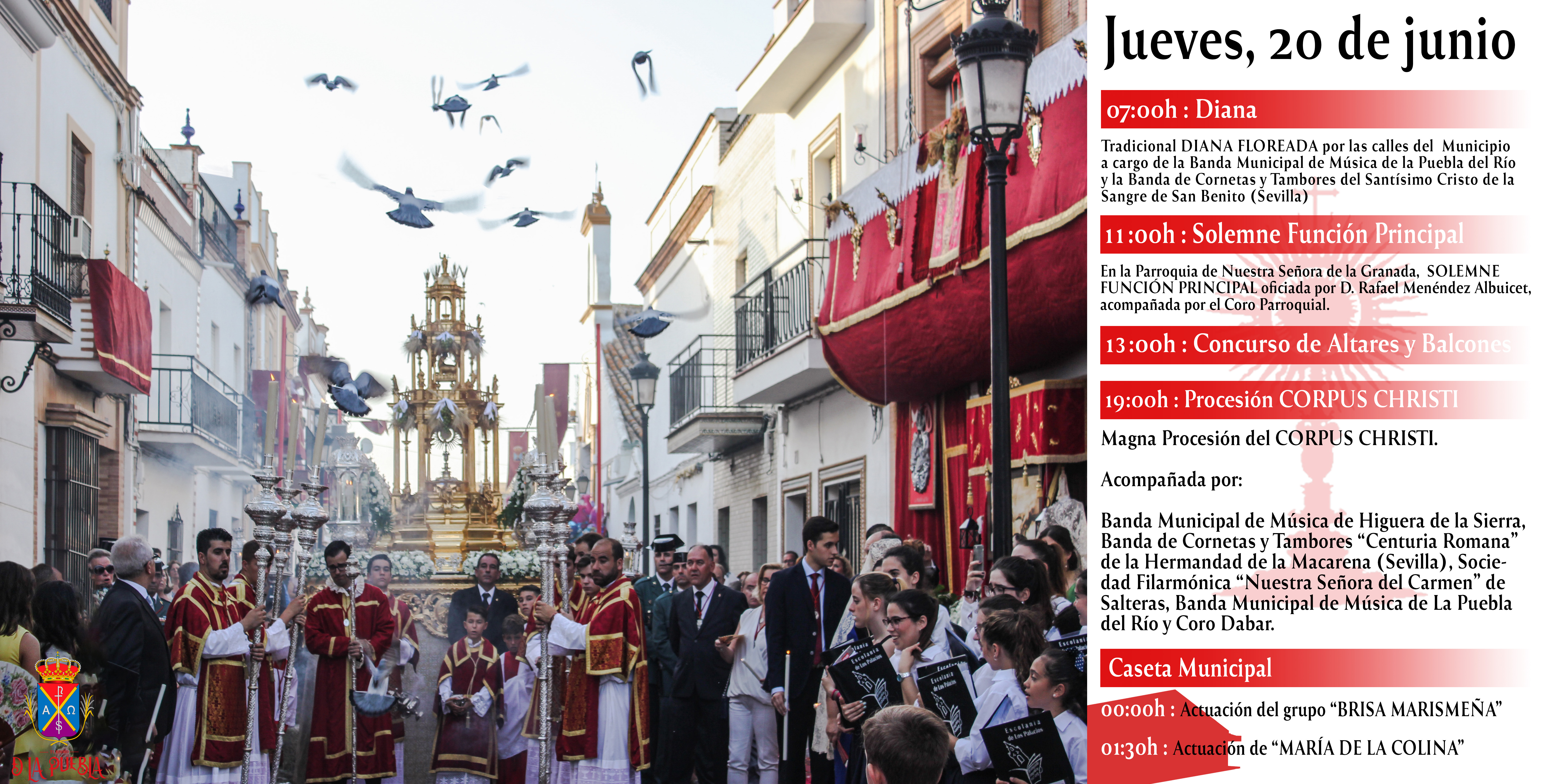 a las 19:30h, Magna Procesión del Corpus, con el acompañamiento musical de la Centuria Macarena, El Carmen de Salteras, Coro Dabar y Banda Municiapal de La Puebla del RÃo.