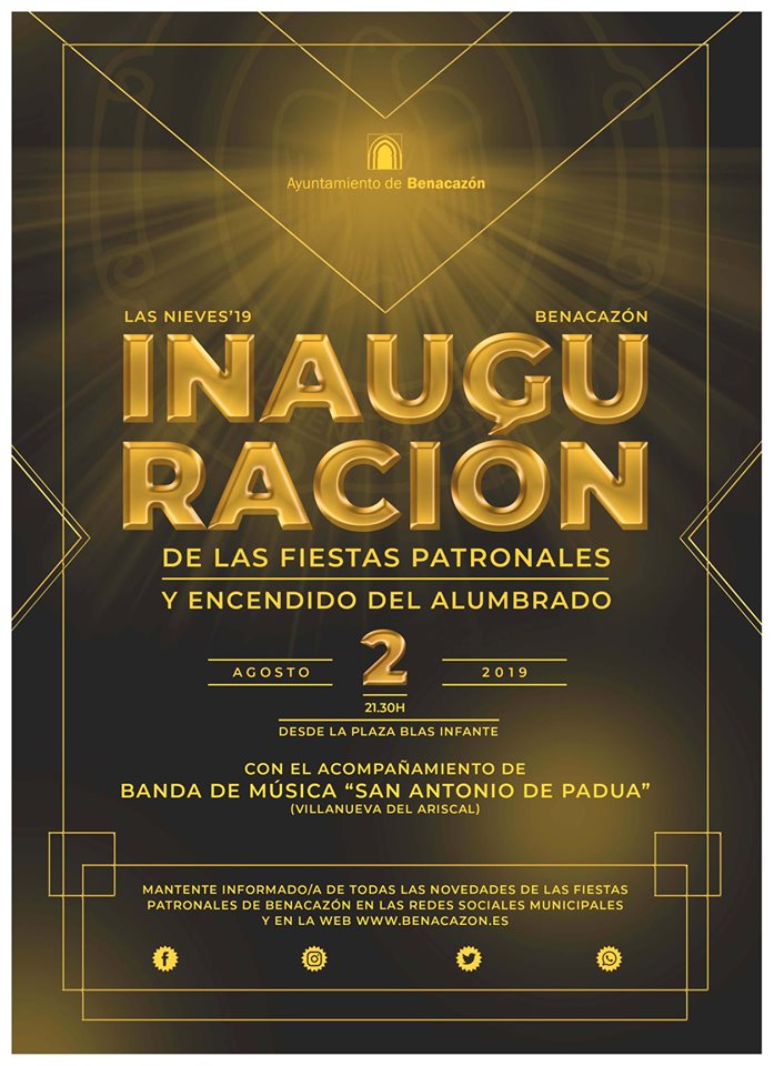 Desde el Ayuntamiento de Benacazón tenemos el placer de anunciarte el acto de Inauguración de las Fiestas Patronales 2019 y encendido del alumbrado que tendrá lugar el 2 de Agosto a las 21.30 horas desde la Plaza del Ayuntamiento (Blas Infante), precedido del Pasacalles de la Banda de Música "San Antonio de Padua" de Villanueva del Ariscal, gracias a la colaboración de la Diputación de Sevilla.