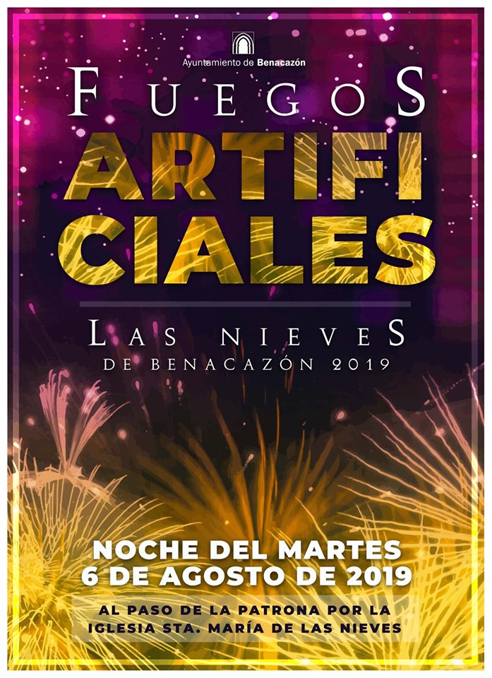 Desde el Ayuntamiento de Benacazón te informamos sobre los tradicionales fuegos artificiales que serán lanzados la noche del 6 de agosto de 2019 en los momentos previos a la recogida de procesión de nuestra Patrona la Virgen de las Nieves, concretamente cuando ésta pase por la Iglesia de Santa María de las Nieves.