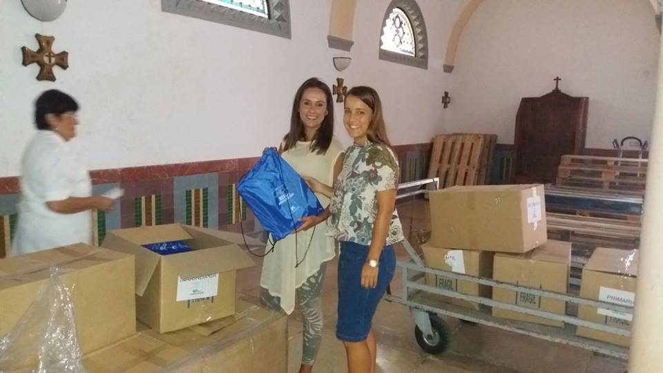 La concejal de Igualdad y Bienestar Social, Lucía Ruiz junto a Inmaculada Guillén de Servicios Sociales recogen el material escolar cedido por la Obra Social de La Caixa en el marco del proyecto denominado 'Un lápiz, una oportunidad', con el que se pretende cubrir las necesidades básicas de material escolar de las fami lias sevillanas que se encuentran en riesgo para la escolarización de sushijos.
