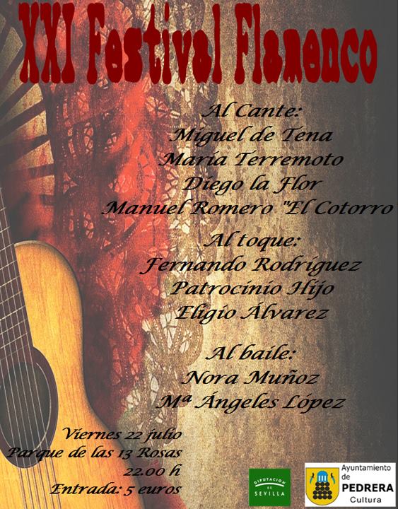 Un año más, el parque de Las 13 Rosas de Pedrera acogerá una nueva apuesta cultural: la vigésimo primera edición del Festival Flamenco. Con una trayectoria dibujada por las figuras más relevantes de la historia de lo jondo, el festival viene siendo, desde su primera edición hace ya más de 20 años, referencia señera de las tres vertientes de este arte: cante, guitarra y baile.