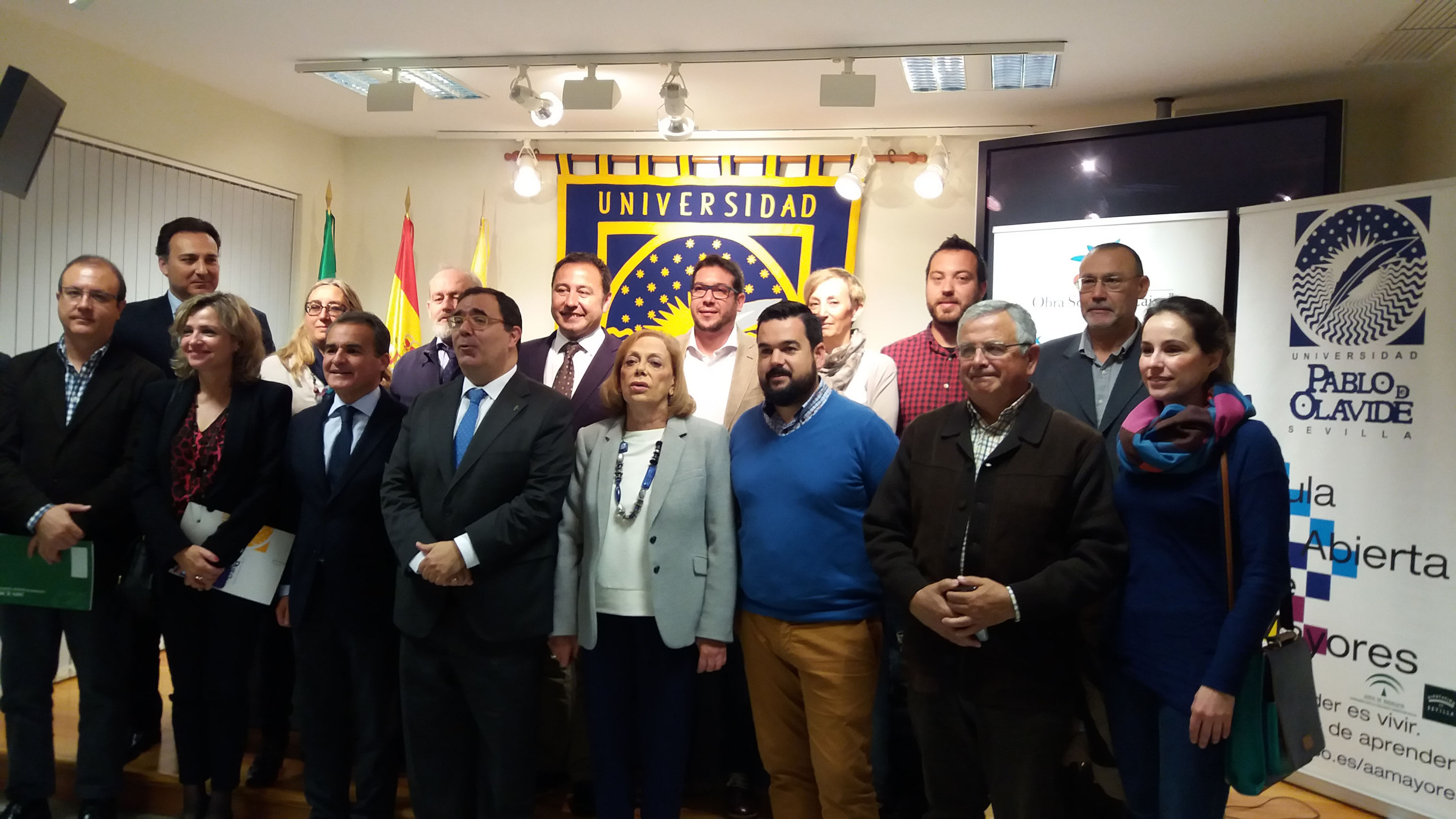 Hoy lunes, en la sala de prensa del Rectorado de la Universidad Pablo de Olavide, el rector de la UPO y presidente de la Fundación Universidad Pablo de Olavide, Vicente Guzmán Fluja, y el director territorial de CaixaBank en Andalucía Occidental, Rafael Herrador, han firmado un acuerdo por el cual Obra Social "La Caixa" apoyará la formación de los estudiantes que integran el Aula Abierta de Mayores UPO. Allí ha estado la concejal de Igualdad, Lucía Ruiz y el coordinador del Aula Abierta en Pedrera, Juan Ruiz