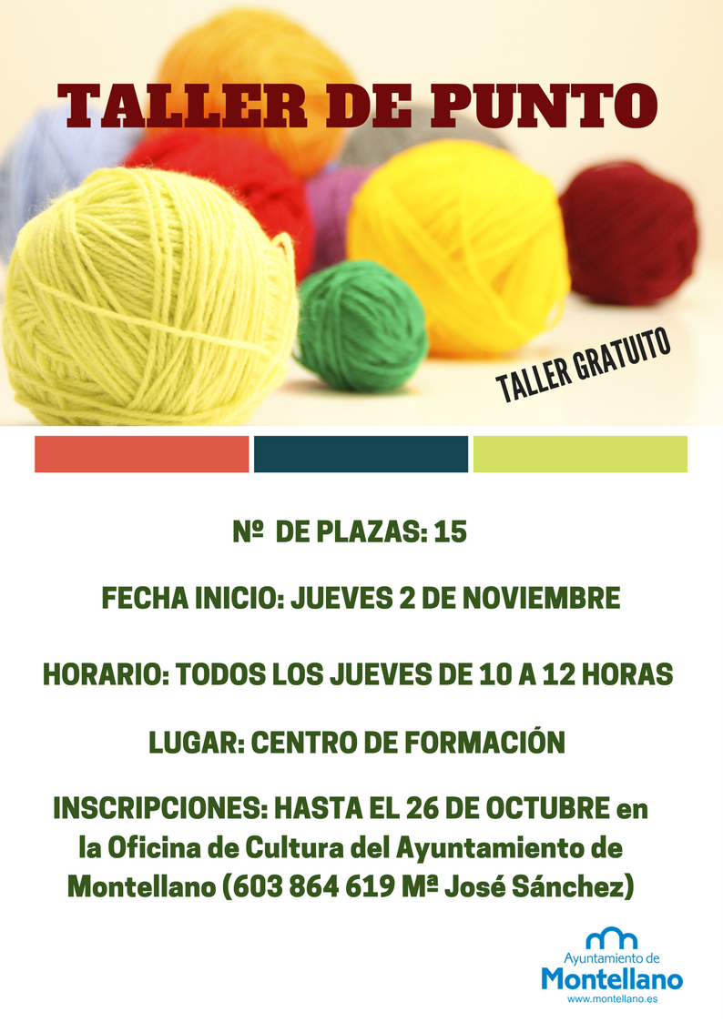 Abierto el plazo de inscripción para apuntarse al Taller de Punto. El Taller comenzará el jueves 2 de noviembre. La impartición del taller será cada jueves de 10 a 12 de la mañana en el Centro de Formación. Los interesados podrán inscribirse antes del 26 de octubre en el Área de Cultura del Ayuntamiento de Montellano (Mª José Sánchez).