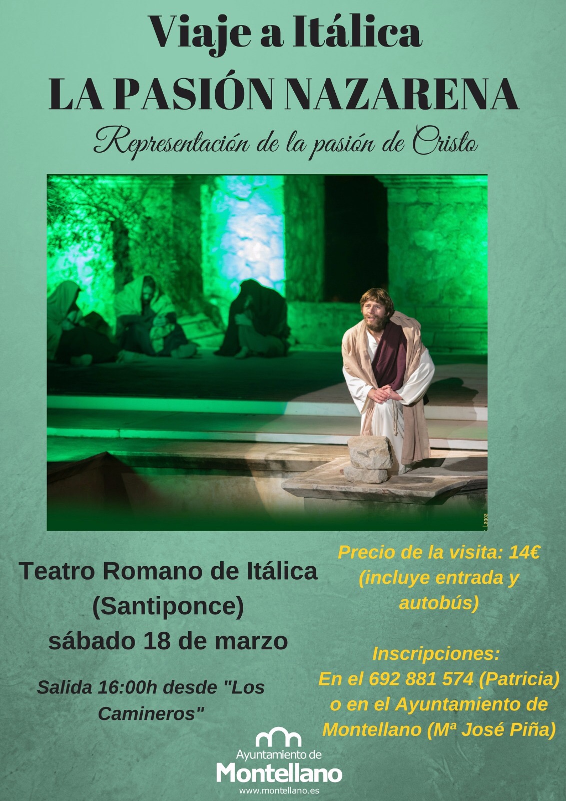 El próximo sábado 18 de marzo el Ayuntamiento organizará un viaje al Teatro Romano de Itálica, donde se representará "La Pasión Nazarena". Los interesados podrán reservar su plaza en Registro General del Ayuntamiento o bien llamando al número de teléfono 692 881 574, el precio de la visita es de 14 € e incluye desplazamiento en autobus y entrada.