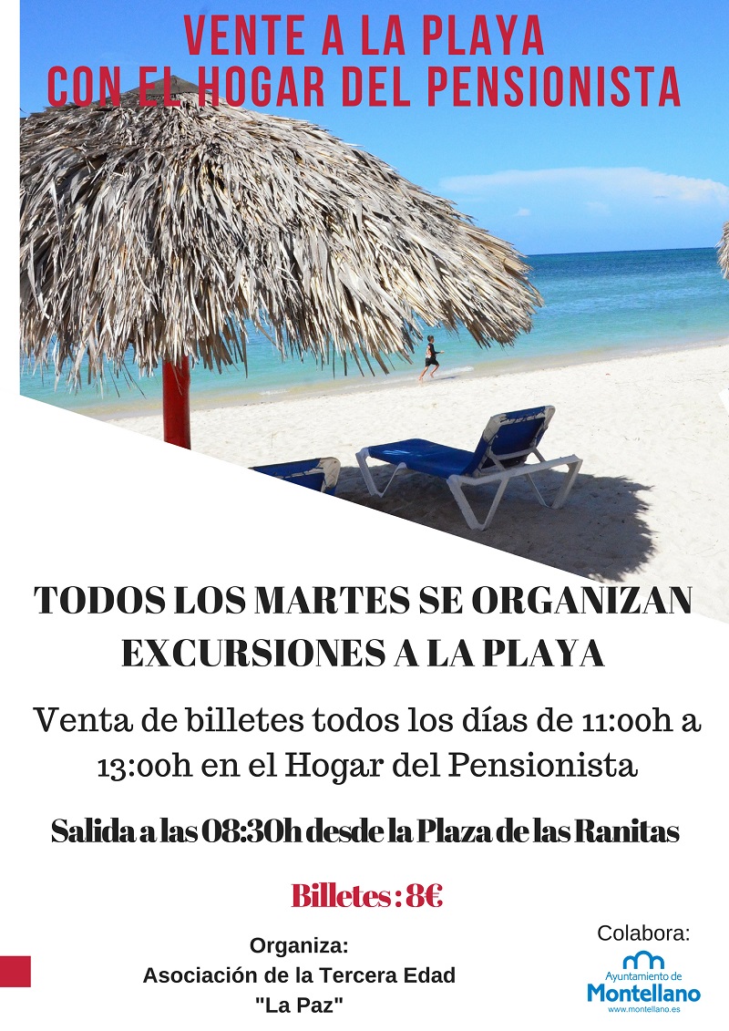 La Asociación de la Tercera Edad "La Paz" de Montellano organiza cada martes un viaje a distintas playas. La venta de billetes se realizará en horario de lunes a viernes en el Hogar del Pensionista de 11:00h a 13:00horas.